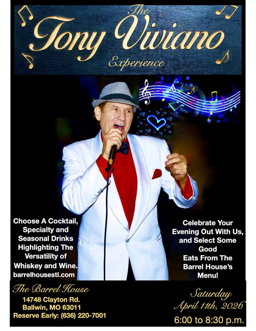 HomeEventsTony Viviano Experience Tony Viviano Experience Saturday, April 11, 2026 6:00 PM - 8:30 PM 6:00 PM - 8:30 PM See all dates and Times Barrel House Parking Deals Get a Ride LYFT UBER Add to Calendar 04/11/2026 06:00 PM 04/11/2026 08:30 PM America/Atikokan Tony Viviano Experience Tony Viviano Experience is from 6-8:30 p.m. on Saturday April, 11 at The Barrel House, 14748 Clayton Road in Ballwin. For details, visit barrelhousestl.com or call, (636) 220-7001. Details & Tickets: https://www.upcomingevents.com/st-louis/events/barrel-house/tony-viviano-experience-625865?ref=uceaddevent Barrel House, 14748 Clayton Road, Ballwin, MO, 63011 Set Reminder Categories Indoor / Outdoor Event, Live Entertainment, Live Performance, Performing Arts Tony Viviano Experience is from 6-8:30 p.m. on Saturday April, 11 at The Barrel House, 14748 Clayton Road in Ballwin. For details, visit barrelhousestl.com or call, (636) 220-7001.