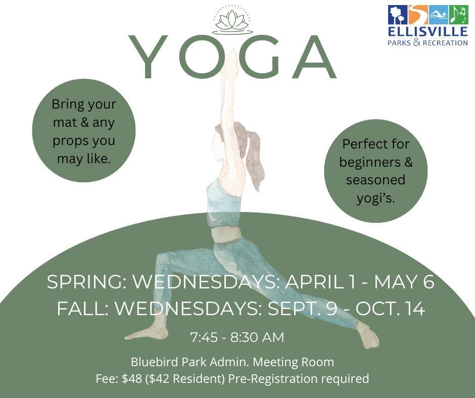 Yoga is from 7:45-8:30 a.m. on Wednesdays, April 1 through May 6 at Bluebird Park (Administration Building), 225 Kiefer Creek Road in Ellisville. Improve posture & flexibility in this 45 minute grounding yoga practice. Bring a yoga mat and any props like blocks/straps. The cost is $42 for residents and $48 for non-residents. To register, visit ellisville.recdesk.com/Community/Program/Detail?programId=1652 or call (636) 227-7508.