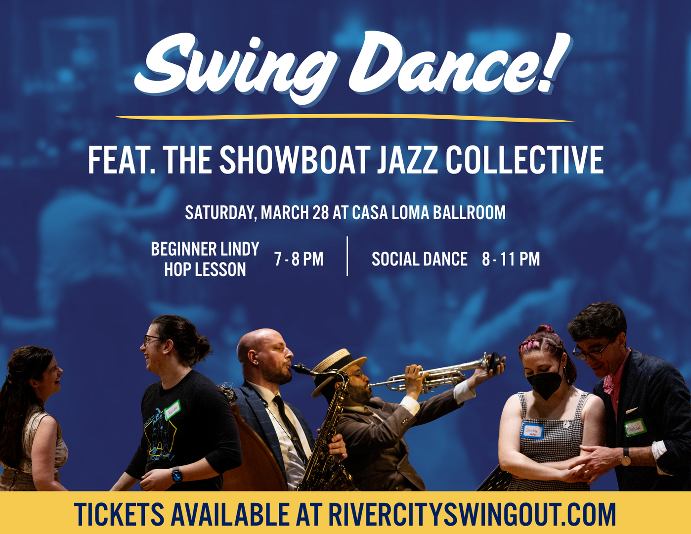 Let’s dance! Join us for the Saturday Main Dance of our River City Mess Around swing dance weekend. Hop into our Beginner Lindy Hop Lesson at 7pm before the dance to learn some swing dance basics, then dance the night away from 8 to 11pm to the sweet sounds of The Showboat Jazz Collective.