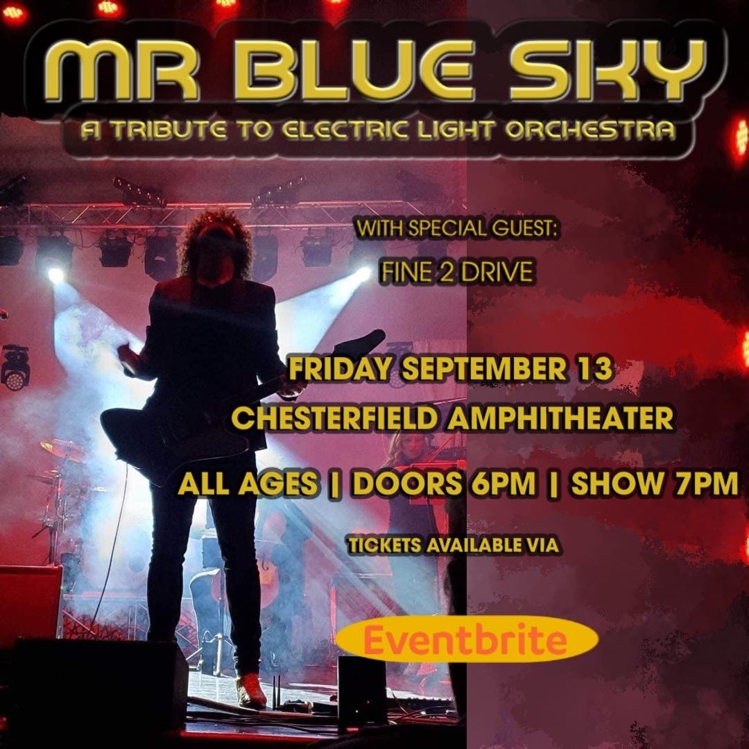 Mr. Blue Sky - A Tribute to Electric Light Orchestra with Special Guest: Fine 2 Drive is at 7 p.m. on Friday, Sept. 13 at the Chesterfield Amphitheater, 631 Veterans Place Drive. Doors open at 6 p.m. Tickets start at $15. All ages. Special guest - Steve Ewing Duo. To purchase tickets, visit Eventbrite and search Mr. Blue Sky.