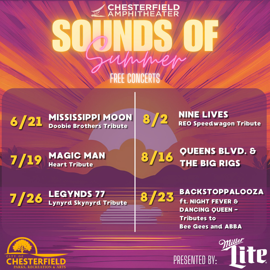 Sounds of Summer Concert Series is from 6-10 p.m. (doors open at 5:30 p.m.) on August 2 at the Chesterfield Amphitheater, featuring live music from the area’s best tribute bands. Free event. Food trucks available. Guests are welcome to bring in their own snacks and alcoholic/non-alcoholic beverages. No full meals or glass. For details, visit chesterfieldamphitheater.com.