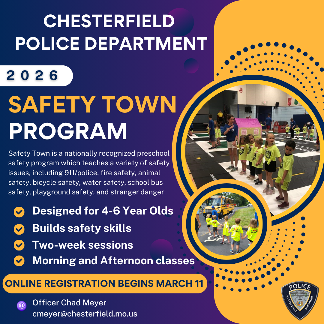 Online registration for the Chesterfield Police Department’s 2026 Safety Town program begins at 8 a.m. on Wednesday, March 11 online at chesterfield.mo.us/394/Safety-Town. Preference will be given to applicants who have not previously attended Safety Town. Safety Town is a nationally recognized preschool safety program that teaches 4, 5 and 6-year-olds about a wide variety of safety issues, including 911/police, fire safety, animal safety, bicycle safety, water safety, school bus safety, playground safety, internet safety and stranger danger. The program includes classroom and hands-on activities in the miniature Safety Town city. The program is hosted and staffed by the Chesterfield Police Department and consists of seven two-week sessions from June 1-July 31. All Safety Town sessions for 2026 will be held at Chesterfield Community Church,14647 Ladue Road in Chesterfield. For details, call (606) 537.6769.