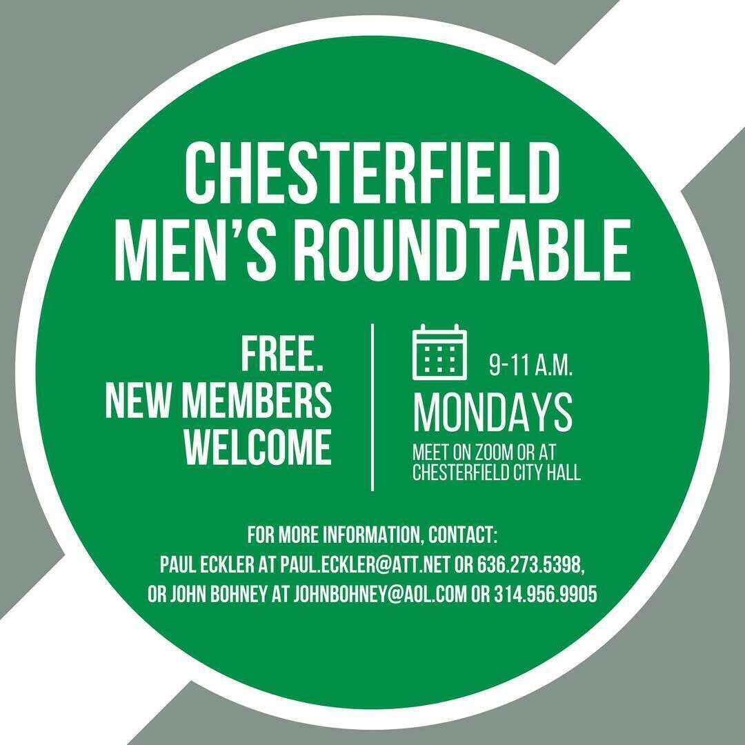 Chesterfield Men’s Roundtable meets from 9-11 a.m. on Mondays via Zoom. Discuss news of the day or topics suggested by members. Free. New members welcome. For details, call (636) 273-5398.