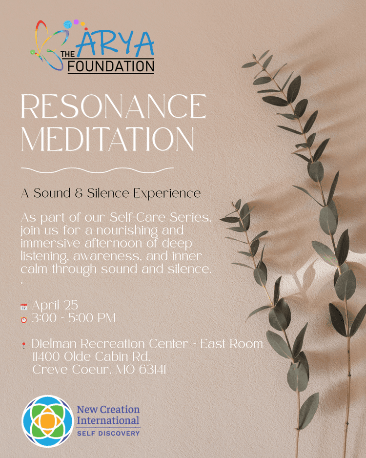Resonance Meditation - A Sound and Silence Experience is from 3-5 p.m. on Saturday, April 25 at the Dielman Recreation Center, 11400 Olde Cabin Road in Creve Coeur. Join for an immersive session designed to provide deep listening, awareness and inner calm. Sharpen your self-awareness through guided sound therapy. For details, visit thearyafoundation.org.
