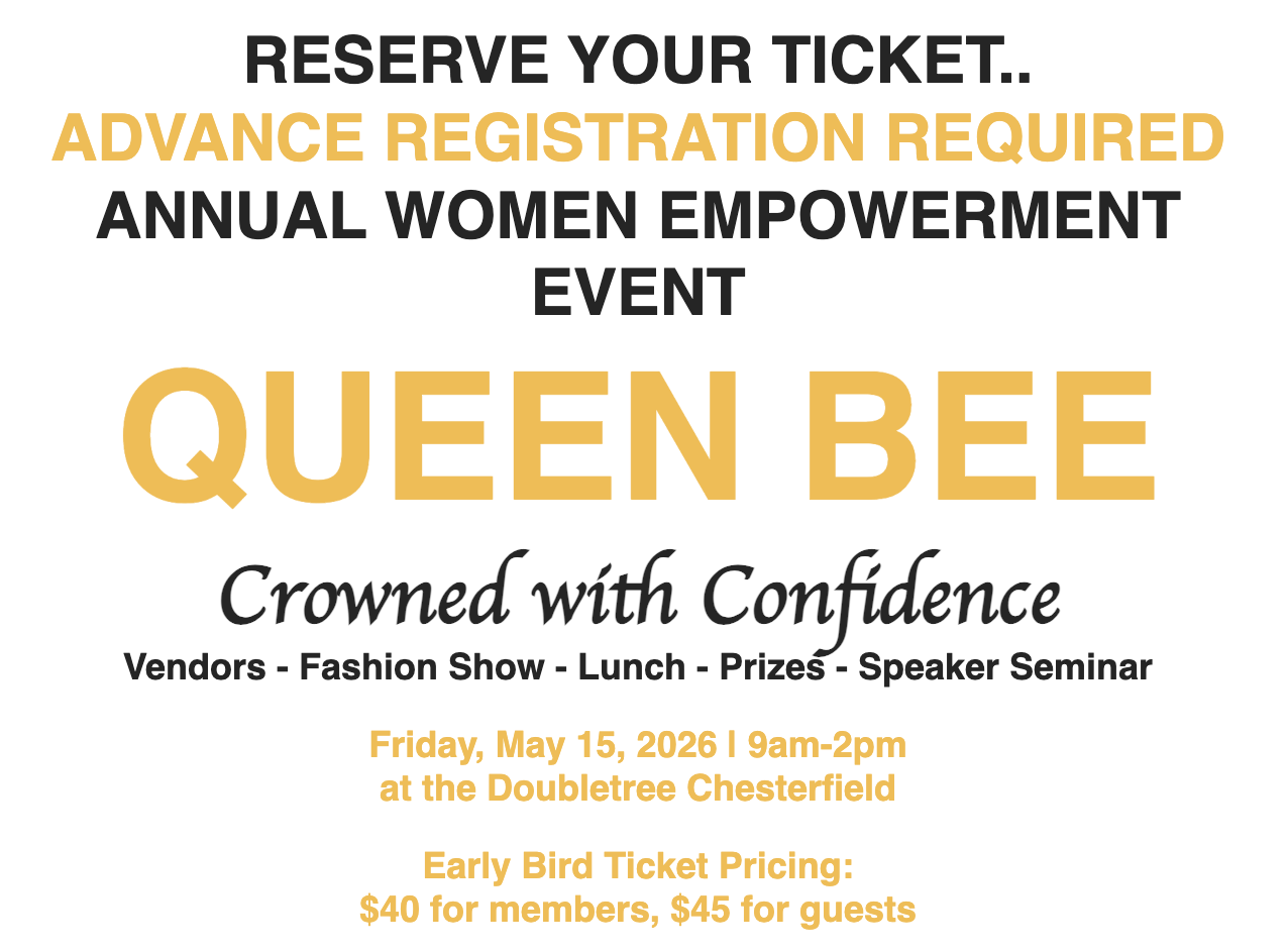 Women's Empowerment Seminar "Queen Bee - Crowned with Confidence" is from 9 a.m.-2 p.m. on Friday, May 15 at the Doubletree Chesterfield, 16625 Swingley Ridge Road, featuring vendors, a fashion show, lunch, prizes, speaker seminar and more. $40 for members, $45 for guests. For details, email [email protected].
