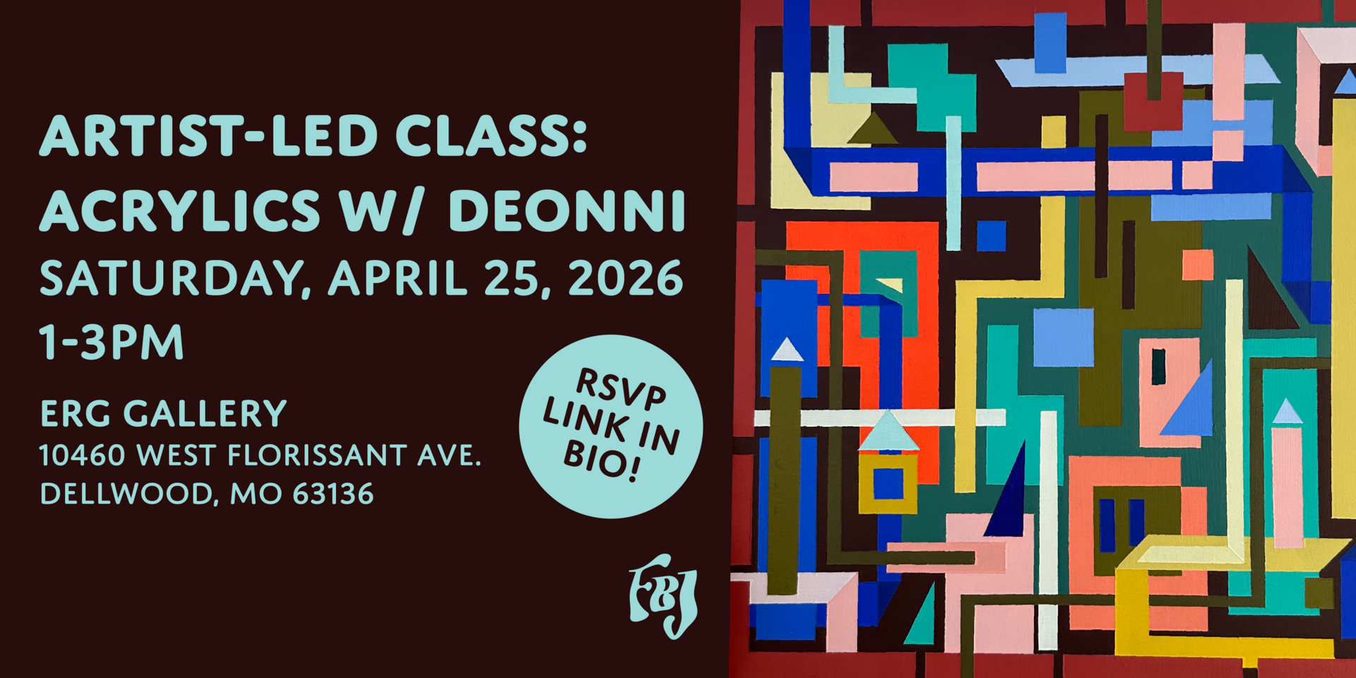 HomeEventsArtist-Led Class: Acrylics with Deonni Artist-Led Class: Acrylics with Deonni Saturday, April 25, 2026 1:00 PM - 3:00 PM 1:00 PM - 3:00 PM See all dates and Times ERG Gallery Parking Deals Get a Ride LYFT UBER Add to Calendar 04/25/2026 01:00 PM 04/25/2026 03:00 PM America/Atikokan Artist-Led Class: Acrylics with Deonni Artist Deonni Thomas leads an acrylic class where students learn to replicate her abstract art style.Event LinksTickets: https://go.evvnt.com/3595151-0 Details & Tickets: https://www.upcomingevents.com/st-louis/events/erg-gallery/artist-led-class-acrylics-with-deonni-642568?ref=uceaddevent ERG Gallery, 10460 West Florissant Avenue, St. Louis, MO, 63136 Set Reminder Categories Art Galleries & Exhibits, Arts Oriented, Museums & Attractions Artist Deonni Thomas leads an acrylic class where students learn to replicate her abstract art style.Event LinksTickets: https://go.evvnt.com/3595151-0 Read More View Less