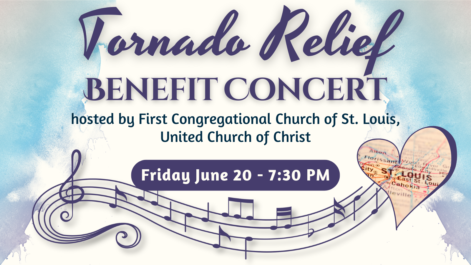 All are welcome to attend a benefit concert at First Congregational Church of St. Louis on Friday, June 20 at 7:30 PM, to support those affected by the recent tornado in our area. This powerful evening of music will feature an orchestra of more than 50 volunteer musicians conducted by our Minister of Music, Tim Clark, as well as a moving choral piece performed by members of our church and the wider community. Admission is free, and donations will be gratefully received to aid in tornado relief efforts.