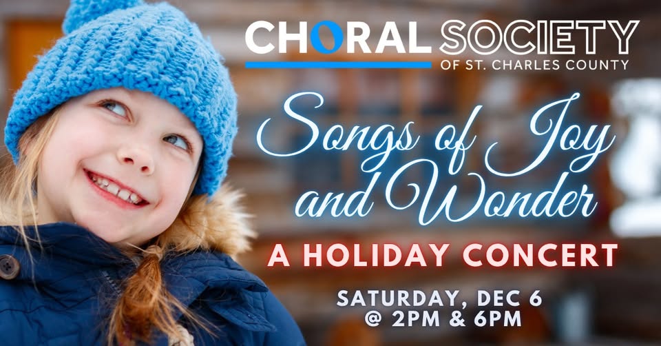 HomeEventsThe Choral Society of St. Charles County Presents - Songs of Joy and Wonder This Event has Passed The Choral Society of St. Charles County Presents - Songs of Joy and Wonder Saturday, December 06, 2025 2:00 PM - 3:30 PM 2:00 PM - 3:30 PM See all dates and Times Fort Zumwalt South High School Parking Deals Get a Ride LYFT UBER Facebook Event Add to Calendar 12/06/2025 02:00 PM 12/06/2025 03:30 PM America/Bahia_Banderas The Choral Society of St. Charles County Presents - Songs of Joy and Wonder Come hear the sounds of the season as the JH Community Choir and Orchestra and the Choral Society Youth Choirs present their holiday concert. Tickets are available online at https://choralsocietyofscc.org/events/ Details & Tickets: https://www.upcomingevents.com/st-louis/events/fort-zumwalt-south-high-school/the-choral-society-of-st-charles-county-presents-songs-of-joy-and-wonder-564257?ref=uceaddevent Fort Zumwalt South High School, 8050 Mexico Rd, St Peters, MO, 63376 Set Reminder Event Tag Concert, Free Parking, Good For Families, Good For Singles, Kid-Friendly, Live Entertainment Categories Concerts, Holiday, Kids & Family, Performing Arts, Singles View Event Website » Come hear the sounds of the season as the JH Community Choir and Orchestra and the Choral Society Youth Choirs present their holiday concert. Tickets are available online at https://choralsocietyofscc.org/events/ Read More View Less