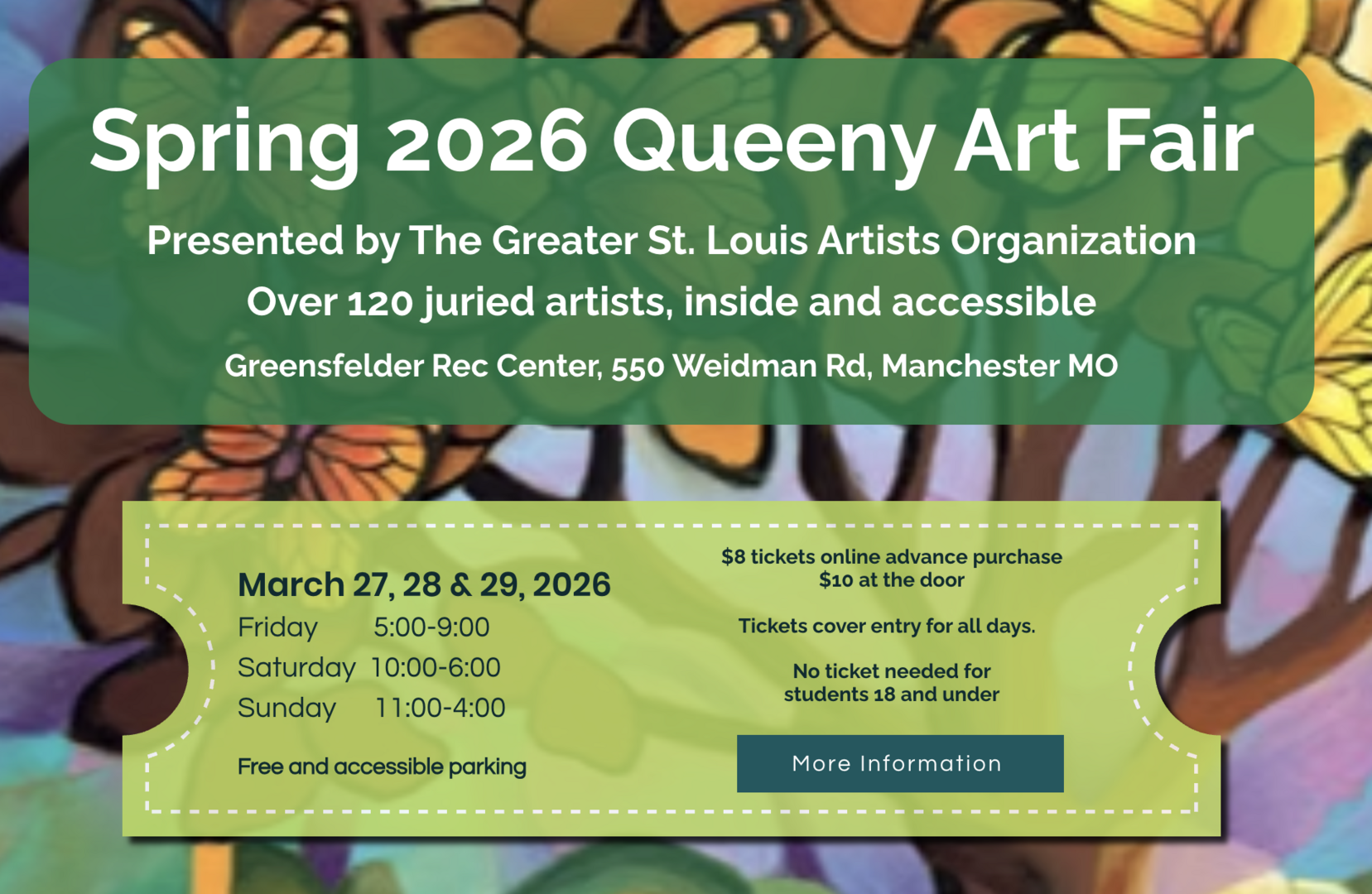 The Spring Queeny Art Fair is from 5-9 p.m. on Friday, March 27, from 10 a.m.-6 p.m. on Saturday, March 28 and from 11 a.m.-4 p.m. on Sunday, March 29 at the Greensfelder Recreation Complex, 550 Weidman Road in Manchester, featuring over 120 juried artists. Tickets are $8 via online advanced purchase or $10 at the door. The ticket is valid for all three days. Students 18 and under are free with an adult. Free and accessible parking. For details, visit artfairatqueenypark.com.