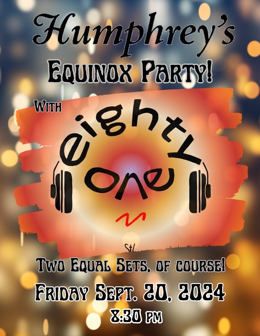 HomeEventsEighty-One Equinox Party This Event has Passed Eighty-One Equinox Party Friday, September 20, 2024 8:00 PM - 11:30 PM 8:00 PM - 11:30 PM See all dates and Times Humphrey's Restaurant & Tavern Parking Deals Get a Ride LYFT UBER Add to Calendar 09/20/2024 08:00 PM 09/20/2024 11:30 PM America/Bahia_Banderas Eighty-One Equinox Party Eighty-One plays classic rock and deep cuts/ Details & Tickets: https://www.upcomingevents.com/st-louis/events/humphreys-restaurant-tavern/eighty-one-equinox-party-287902?ref=uceaddevent Humphrey's Restaurant & Tavern, 3700 Laclede Avenue, St. Louis, MO, 63108 Set Reminder Categories Concert, Live Entertainment, Performing Arts Eighty-One plays classic rock and deep cuts/