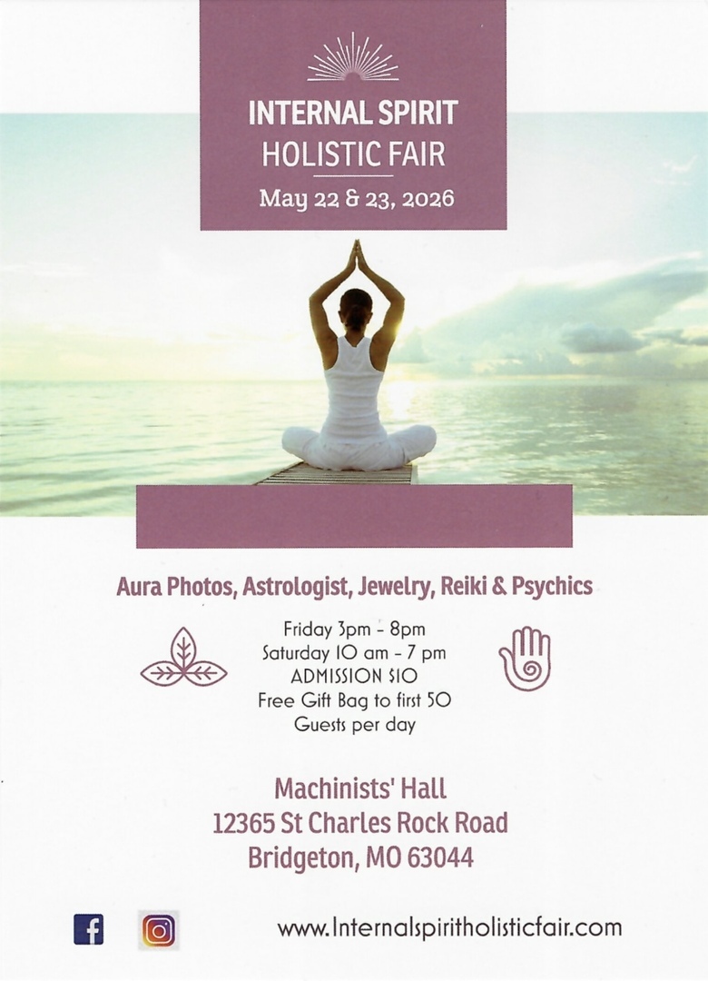 Two day Metaphysical/Holistic/Psychic Fair. Friday, May 22, 2026 from 3 pm to 8 pm and Saturday, May 23, 2026 from 10 am to 7 pm. Admission $10. at the door. Jewelry, Crystals, Stones, Psychics, Tarot and Angel card readers, Astrologer, Pet Psychic, Reiki Masters, Aura and Chakra Photos, and more! Workshops on Saturday. The first 50 guests will receive a gift bag. www.internalspiritholisticfair.com. Facebook & Instagram