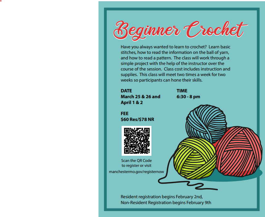 Have you been wanting to learn how to crochet? Join us! Learn basic stitches, how to read the information on a ball of yarn, and how to read a pattern. The class will work through a simple project with the help of the instructor over the course of the session. The class meets two times a week for two weeks so participants can hone their skills. All supplies are included!
