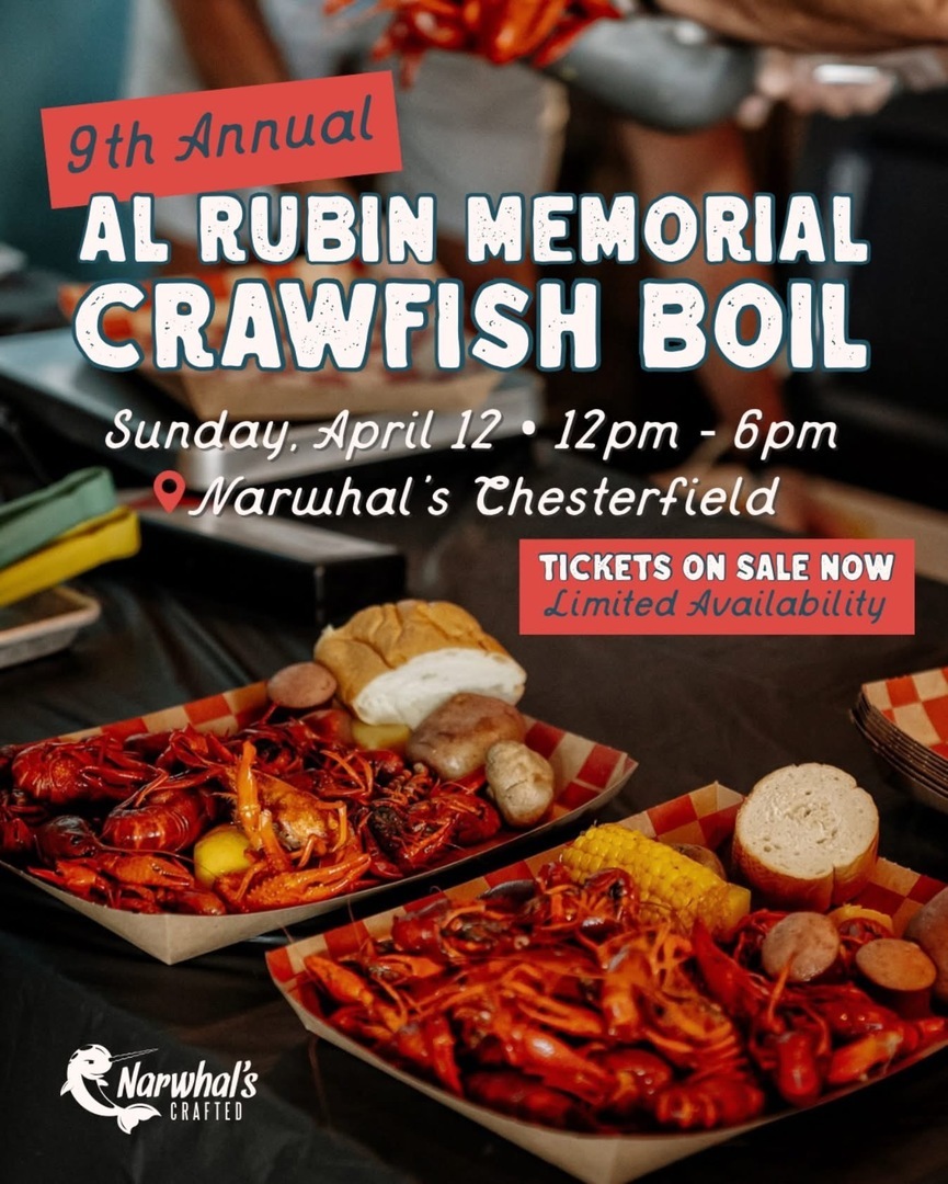 Join us for the 9th Annual Al Rubin Memorial Crawfish Boil at Narwhal’s Crafted in Chesterfield on Sunday, April 12 from 12–6 PM.