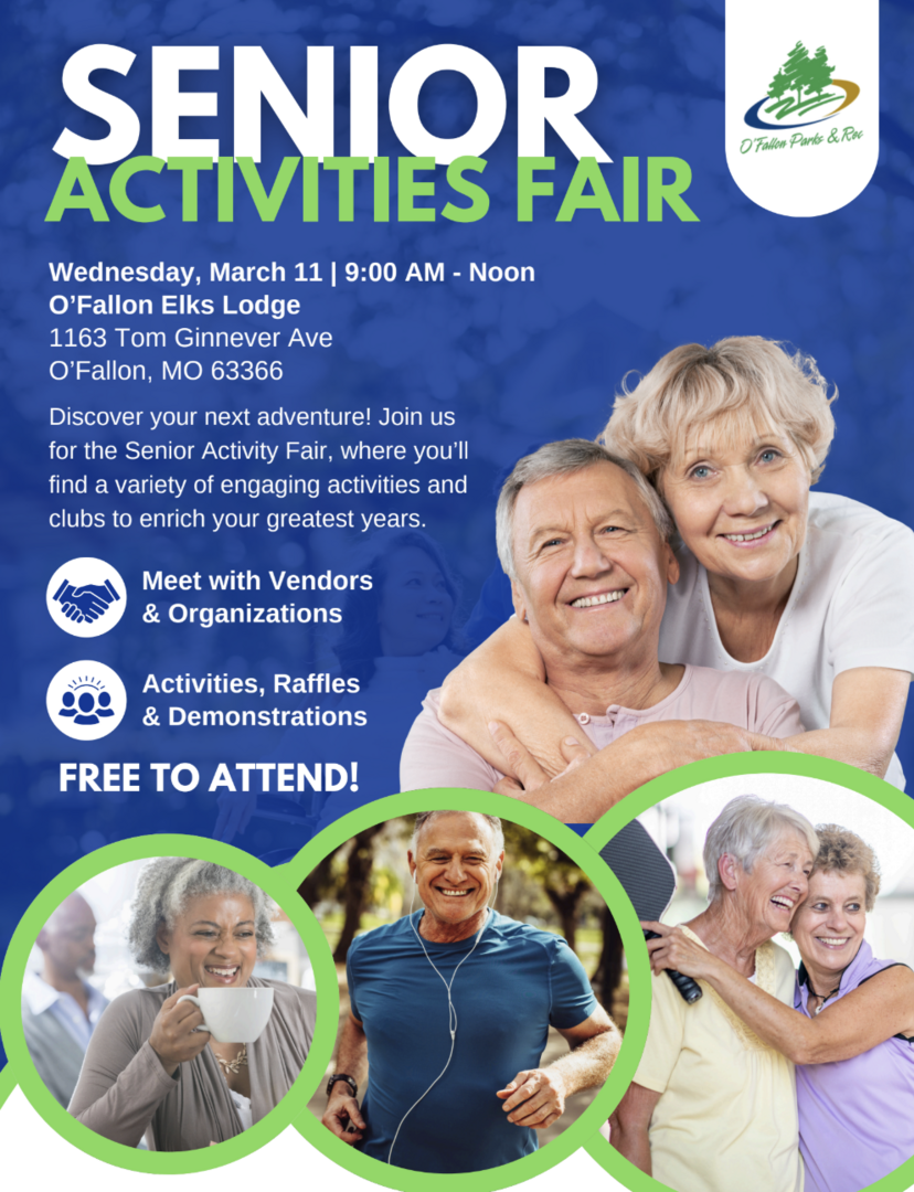 Senior Activities Fair is from 9 a.m. to noon on Wednesday, March 11 at the O'Fallon Elks Lodge, 1163 Tom Ginnever Ave., featuring a variety of engaging activities and clubs to enrich your greatest years. For details, visit ofallonmo.gov/parks&rec.