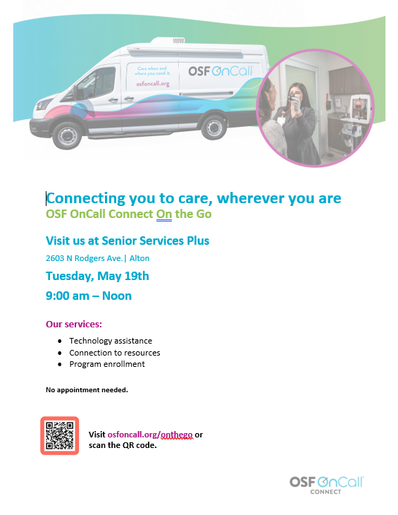 OSF OnCall Connect will be at Senior Services Plus, 2603 N. Rodgers Ave. in Alton, from 9 AM - noon on Tuesday, May 19th. Come for health screenings, technology assistance, resource connection, and program enrollment! No appointment needed; walk-ins are welcome.