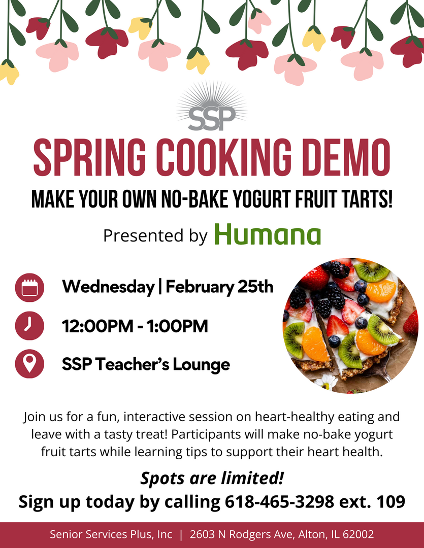 Join us at Senior Services Plus, 2603 N. Rodgers Ave. in Alton, on Wednesday, Feb. 25th from 12-1 PM for a fun, interactive session on heart-healthy eating. You'll leave with your own tasty treat! Participants will make no-bake yogurt fruit tarts while learning tips to support their heart health. There is no cost to attend but spots are limited! Sign up today by calling 618-465-3298 ext. 109!