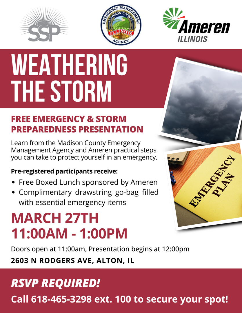 Join us at Senior Services Plus, 2603 N. Rodgers Ave. in Alton, on Friday, March 27th from 12-1 PM for "Weathering the Storm," a lunch-and-learn presentation where older adults can learn practical steps to protect yourself in an emergency. Pre-registered participants will receive a free boxed lunch, thanks to our sponsor, Ameren Illinois! Participants will also receive a complimentary go-bag filled with emergency items. Doors will open at 11 AM and lunch/presentation will begin at noon. Spots are limited and RSVPs are required for this free event! Register today by calling 618-465-3298 ext. 100.