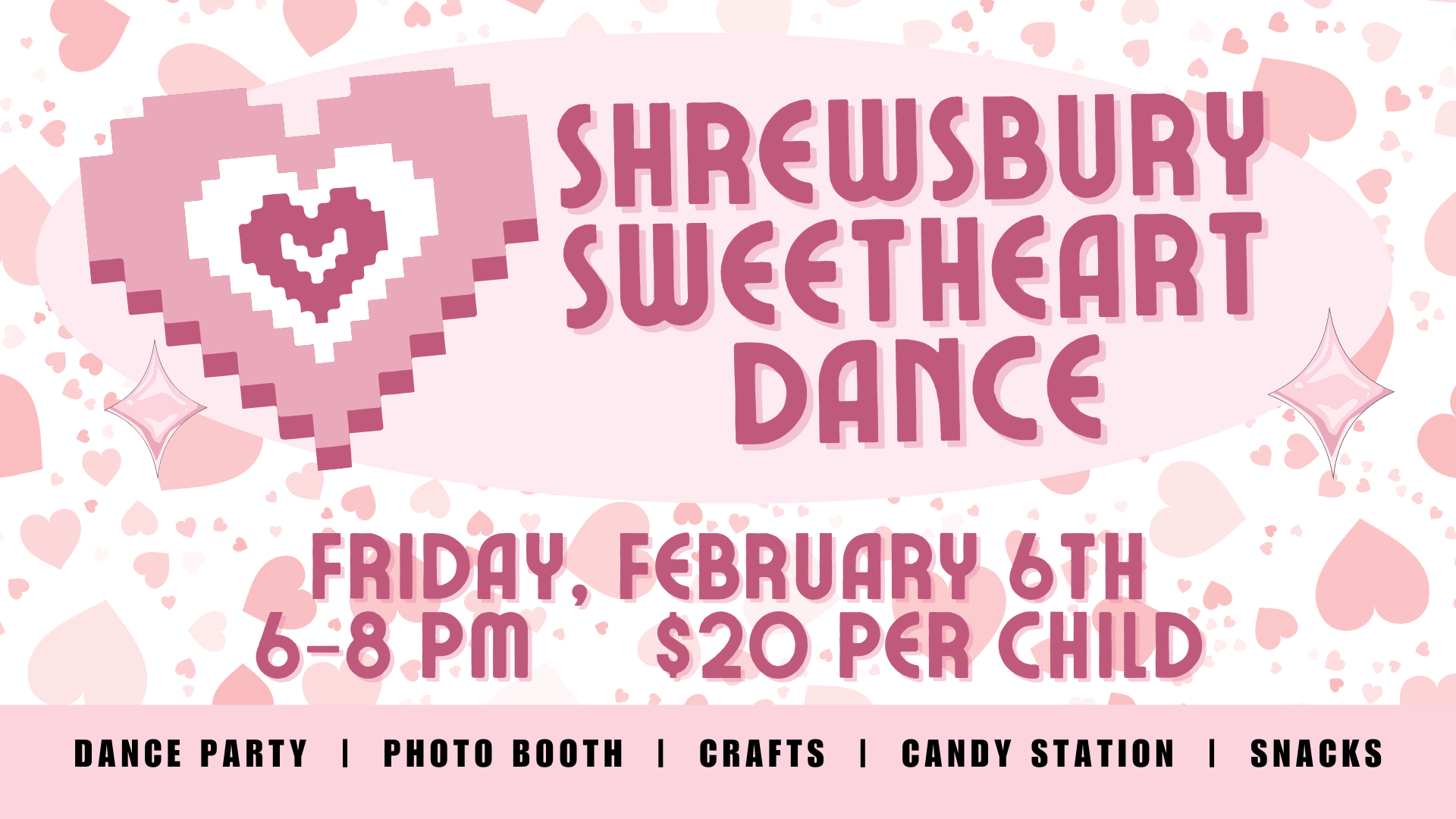 Dads, grandpas, uncles, and guardians β grab your dancing shoes, get ready to strike a pose, and bring your little sweethearts to Shrewsbury for a magical evening of fun and memories! Dance the night away while enjoying snacks, a candy bar, photo opportunities, and crafts. Itβs the perfect chance to make lasting memories with the special little ones in your life. Pre-Registration required.