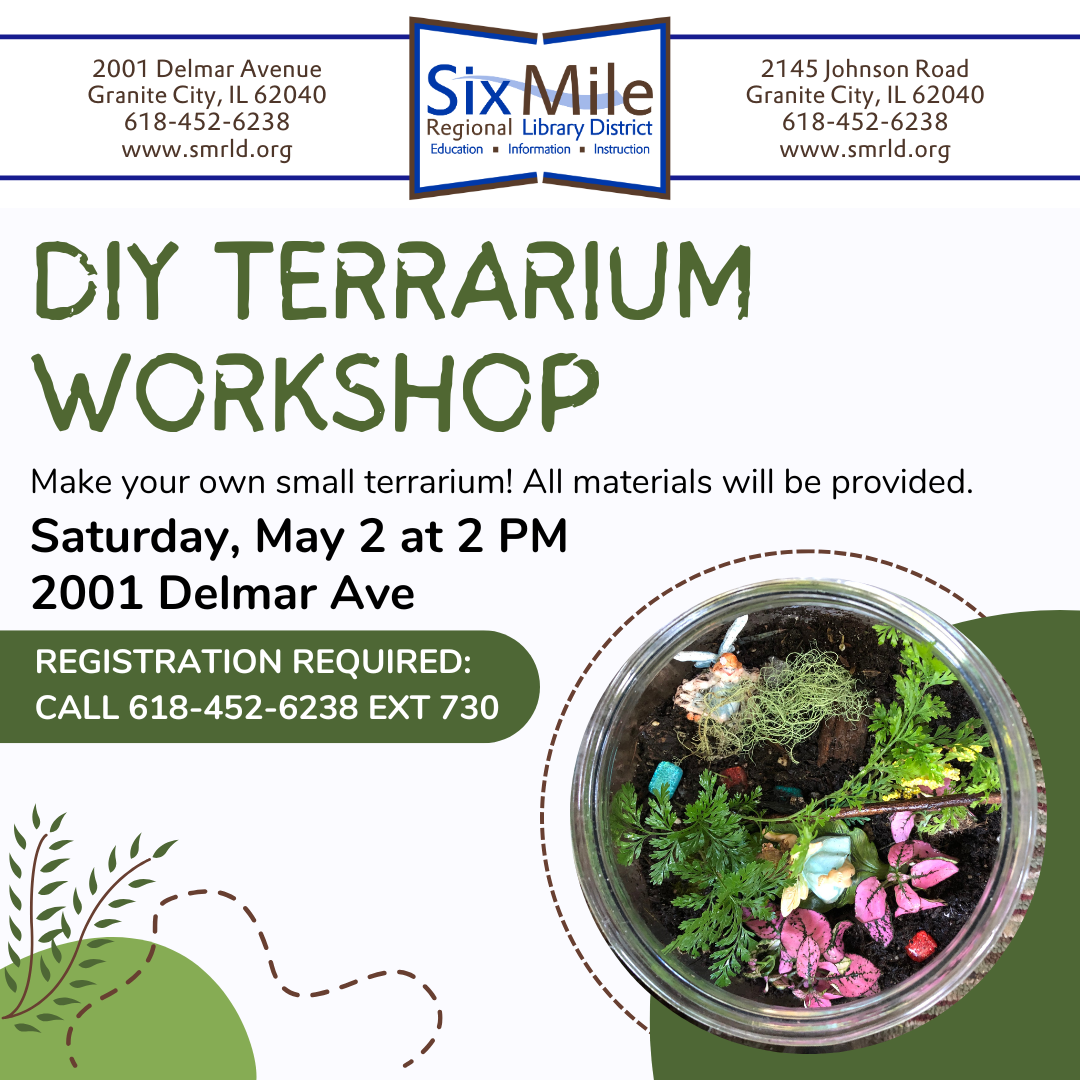HomeEventsDIY Terrarium Workshop: Spring Adult Crafts DIY Terrarium Workshop: Spring Adult Crafts Saturday, May 02, 2026 2:00 PM - 3:00 PM 2:00 PM - 3:00 PM See all dates and Times Six Mile Regional Library District Parking Deals Get a Ride LYFT UBER Add to Calendar 05/02/2026 02:00 PM 05/02/2026 03:00 PM America/Atikokan DIY Terrarium Workshop: Spring Adult Crafts Make your own small terrarium! All materials will be provided. Registration Required: Call 618-452-6238 ext 730Event LinksWebsite: https://go.evvnt.com/3510608-0 Details & Tickets: https://www.upcomingevents.com/st-louis/events/six-mile-regional-library-district/diy-terrarium-workshop-spring-adult-crafts-612138?ref=uceaddevent Six Mile Regional Library District, 2001 Delmar Avenue, Granite City, IL, 62040 Set Reminder Categories Education, Educational, Literary & Books View Event Website » Make your own small terrarium! All materials will be provided. Registration Required: Call 618-452-6238 ext 730Event LinksWebsite: https://go.evvnt.com/3510608-0 Read More View Less