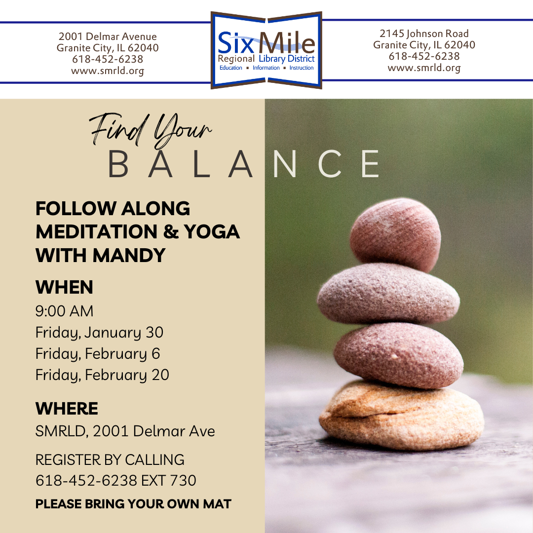 HomeEventsFind Your Balance: Follow Along Meditation & Yoga with Mandy Find Your Balance: Follow Along Meditation & Yoga with Mandy Friday, January 30, 2026 9:00 AM - 10:00 AM 9:00 AM - 10:00 AM See all dates and Times Six Mile Regional Library District Parking Deals Get a Ride LYFT UBER Add to Calendar 01/30/2026 09:00 AM 01/30/2026 10:00 AM America/Bahia_Banderas Find Your Balance: Follow Along Meditation & Yoga with Mandy Register by calling 618-452-6238 Ext 730 Please bring your own mat Event LinksWebsite: https://go.evvnt.com/3398756-0 Details & Tickets: https://www.upcomingevents.com/st-louis/events/six-mile-regional-library-district/find-your-balance-follow-along-meditation-yoga-with-mandy-577752?ref=uceaddevent Six Mile Regional Library District, 2001 Delmar Avenue, Granite City, IL, 62040 Set Reminder Categories Education, Educational, Literary & Books View Event Website » Register by calling 618-452-6238 Ext 730 Please bring your own mat Event LinksWebsite: https://go.evvnt.com/3398756-0