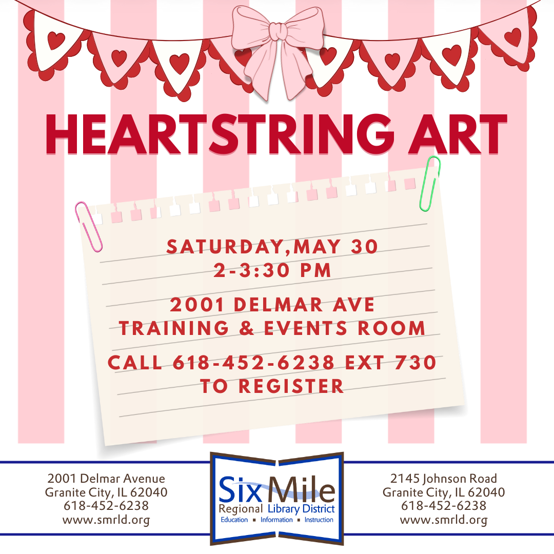 HomeEventsHeartstring Art: Spring Adult Crafts Heartstring Art: Spring Adult Crafts Saturday, May 30, 2026 2:00 PM - 3:30 PM 2:00 PM - 3:30 PM See all dates and Times Six Mile Regional Library District Parking Deals Get a Ride LYFT UBER Add to Calendar 05/30/2026 02:00 PM 05/30/2026 03:30 PM America/Atikokan Heartstring Art: Spring Adult Crafts Call 618-452-6238 ext 730 to registerEvent LinksWebsite: https://go.evvnt.com/3510613-0 Details & Tickets: https://www.upcomingevents.com/st-louis/events/six-mile-regional-library-district/heartstring-art-spring-adult-crafts-612141?ref=uceaddevent Six Mile Regional Library District, 2001 Delmar Avenue, Granite City, IL, 62040 Set Reminder Categories Education, Educational, Literary & Books View Event Website » Call 618-452-6238 ext 730 to registerEvent LinksWebsite: https://go.evvnt.com/3510613-0