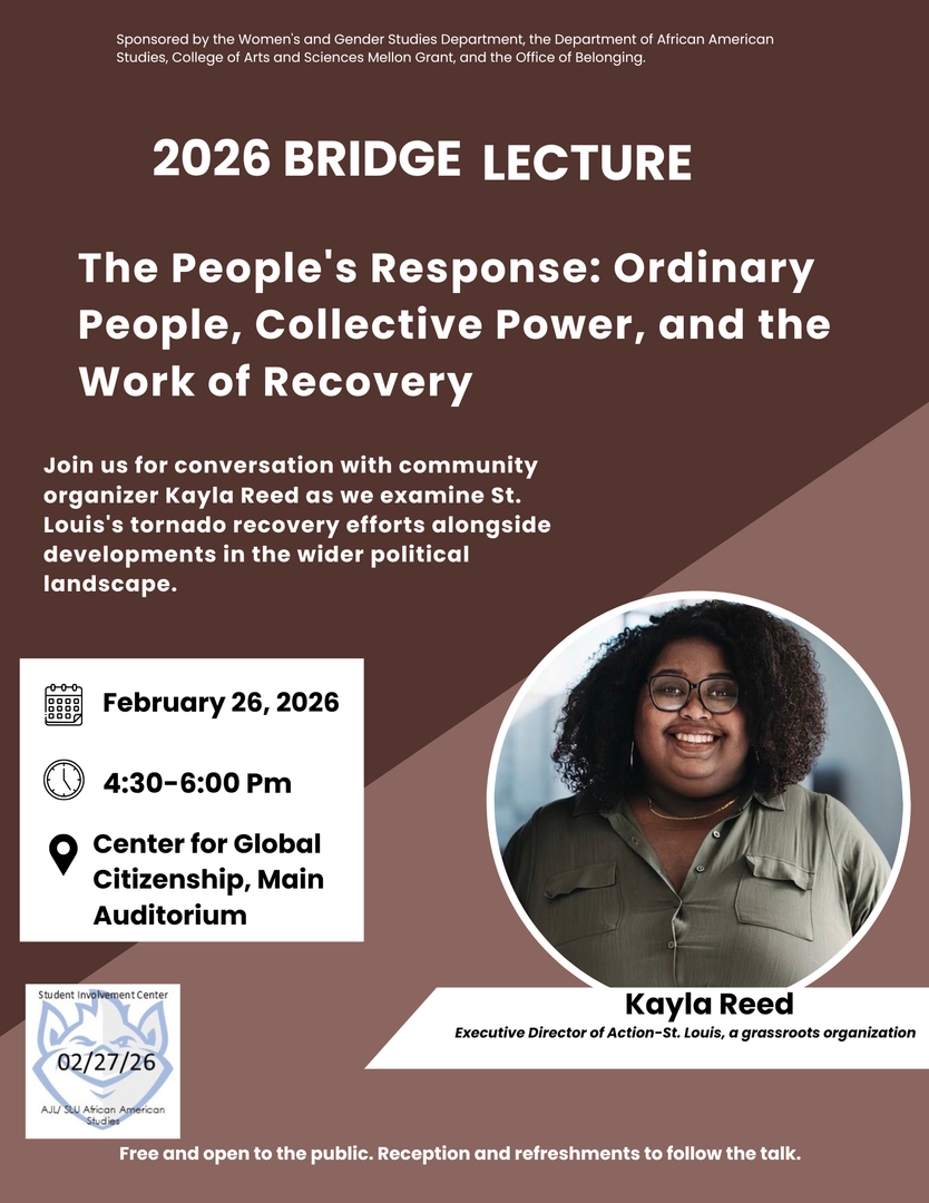 Join SLU's African American Studies and Women's and Gender Studies Departments for conversation with community organizer Kayla Reed as we examine St. Louis's tornado recovery efforts alongside developments in the wider political landscape. Feb. 26, 2026, 4:30-6:00 pm, SLU's Center for Global Citizenship main auditorium. Free and open to the public