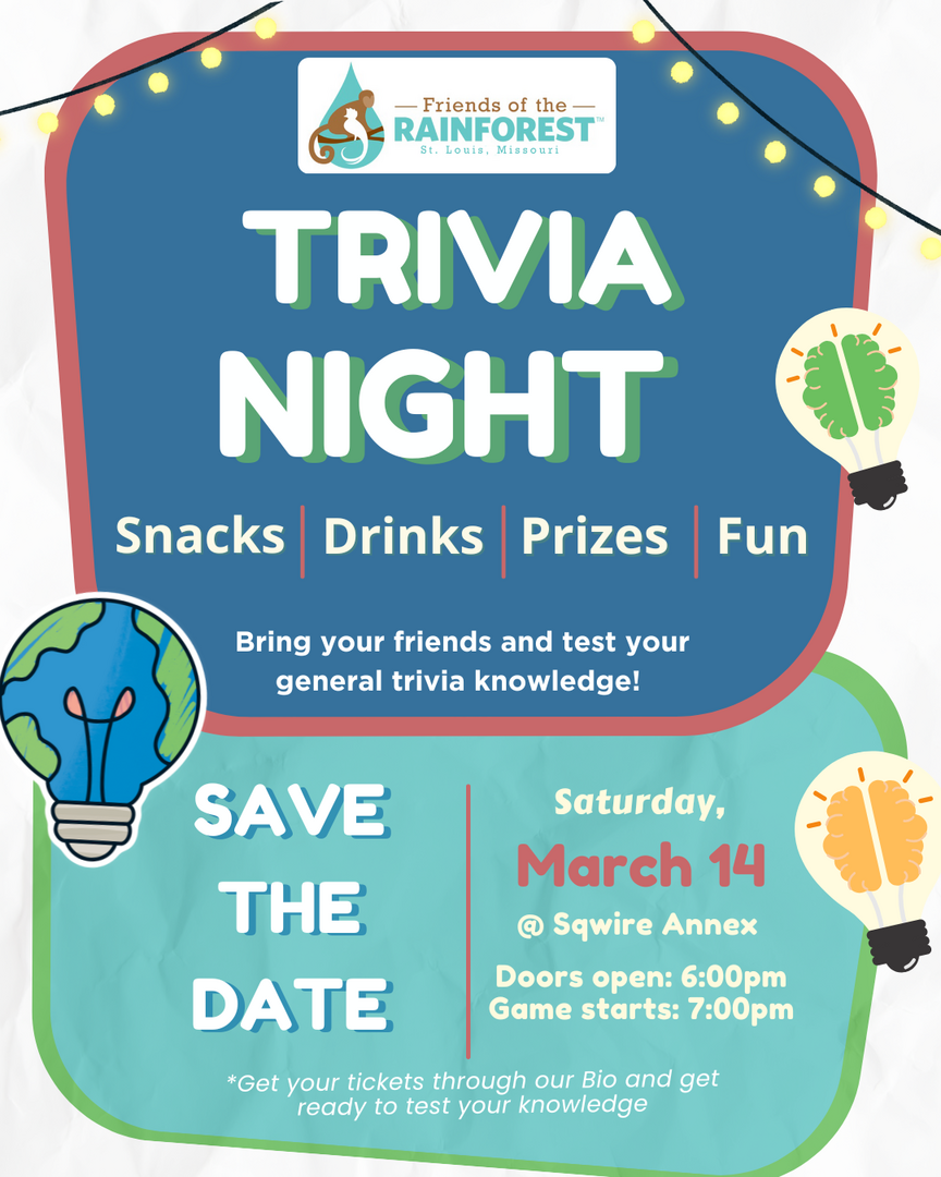 Friends of the Rainforest’s annual Trivia Night is our largest and most anticipated fundraiser of the year. Our mission is to inspire students and community members to care for their environment, animals, and the rainforests that sustain life around the world.