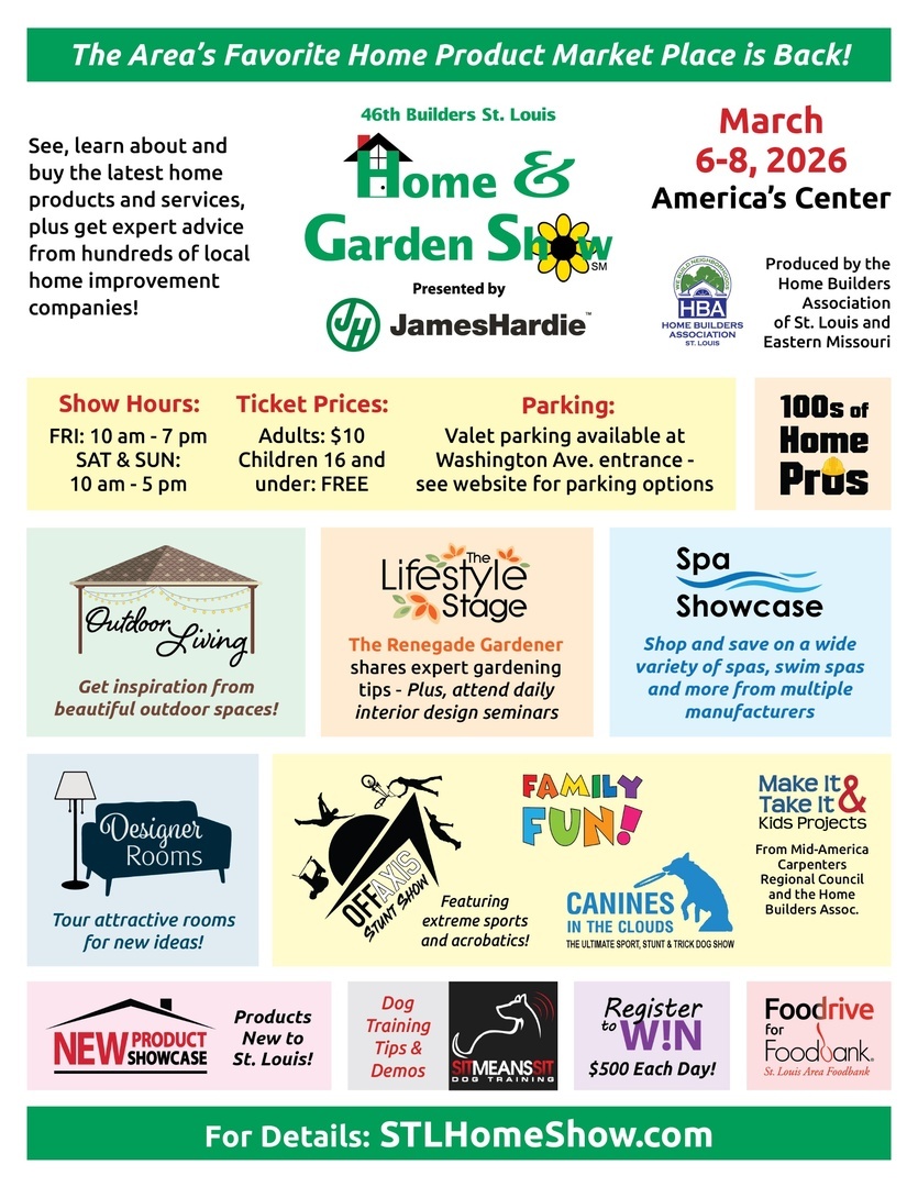 Builders St. Charles Home Show is from 10 a.m.-7 p.m. on Friday, March 6, and Saturday, March 7 and from 10 a.m.-5 p.m. on Sunday, March 8 at the St. Charles Convention Center, 1 Convention Center Blvd. Shop the latest home improvement products in one convenient location. Local experts will have valuable home improvement knowledge and advice. Admission is $10 for adults. Children 16 and under are free. For details, visit STLHomeShow.com.
