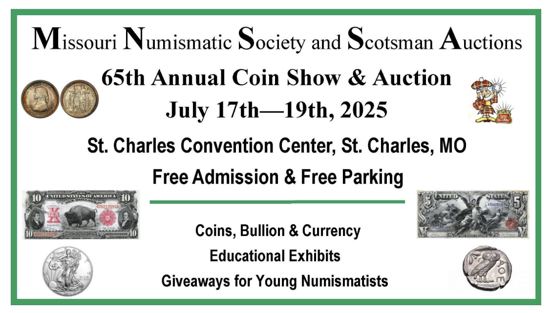 Missouri Numismatic Society's Annual Coin Show is from 10 a.m. to 6 p.m. on Thursday, July 17, 10 a.m. to 6 p.m. on Friday, July 18 and 10 a.m. to 4 p.m. on Saturday, July 19 at the St. Charles Convention Center, featuring over 150 coin dealers, U. S. and Foreign coins and currency, as well as ancient coins. Free to the public and free parking. For details, visit missourinumismaticsociety.org/annual-coin-show.