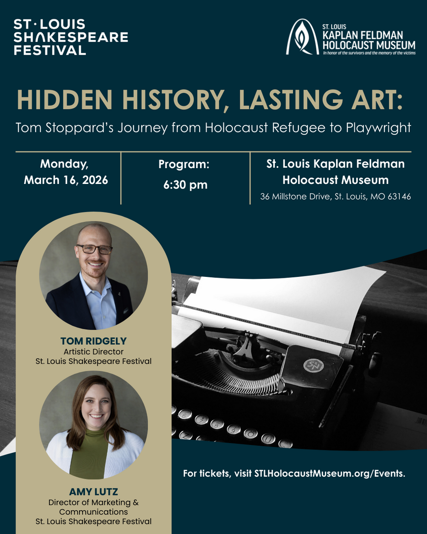 In partnership with the St. Louis Shakespeare Festival, this program explores the extraordinary personal history behind one of the world’s most influential dramatists. Historian Amy Lutz (Director of Marketing & Communications, St. Louis Shakespeare Festival) will share the story of Tom Stoppard’s family’s escape from Nazi-occupied Europe in the shadow of the Anschluss and Stoppard’s later discovery of his Jewish identity, leading to the creation of Leopoldstadt. Tom Ridgely (Artistic Director, St. Louis Shakespeare Festival) will then consider how this history intersects with Stoppard’s theatrical voice, with special attention to his landmark play Rosencrantz & Guildenstern Are Dead. This spring, Ridgely directs the Festival’s production of Rosencrantz & Guildenstern are Dead, which runs from March 26-April 11 at the Kranzberg Arts Center Black Box Theater.