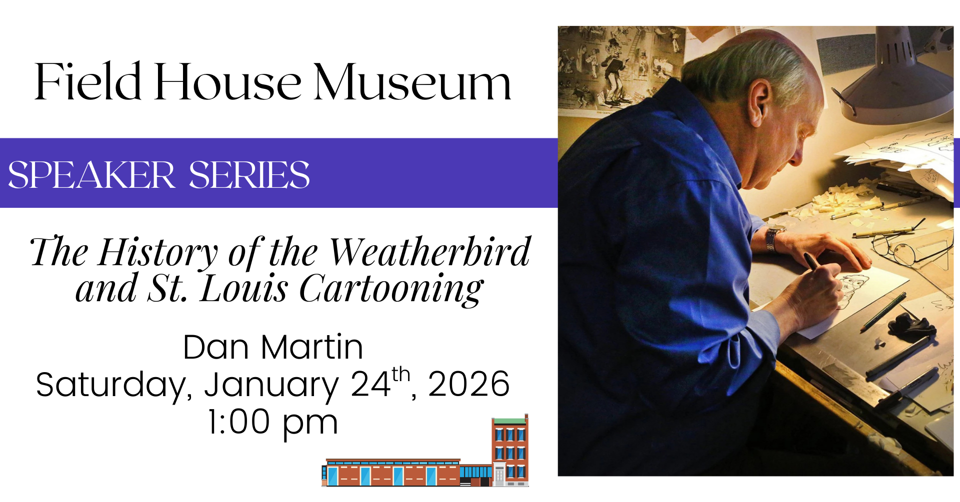 On January 24, 2026, at 1:00 p.m., longtime St. Louis Post-Dispatch cartoonist Dan Martin will present The History of the Weatherbird and St. Louis Cartooning.