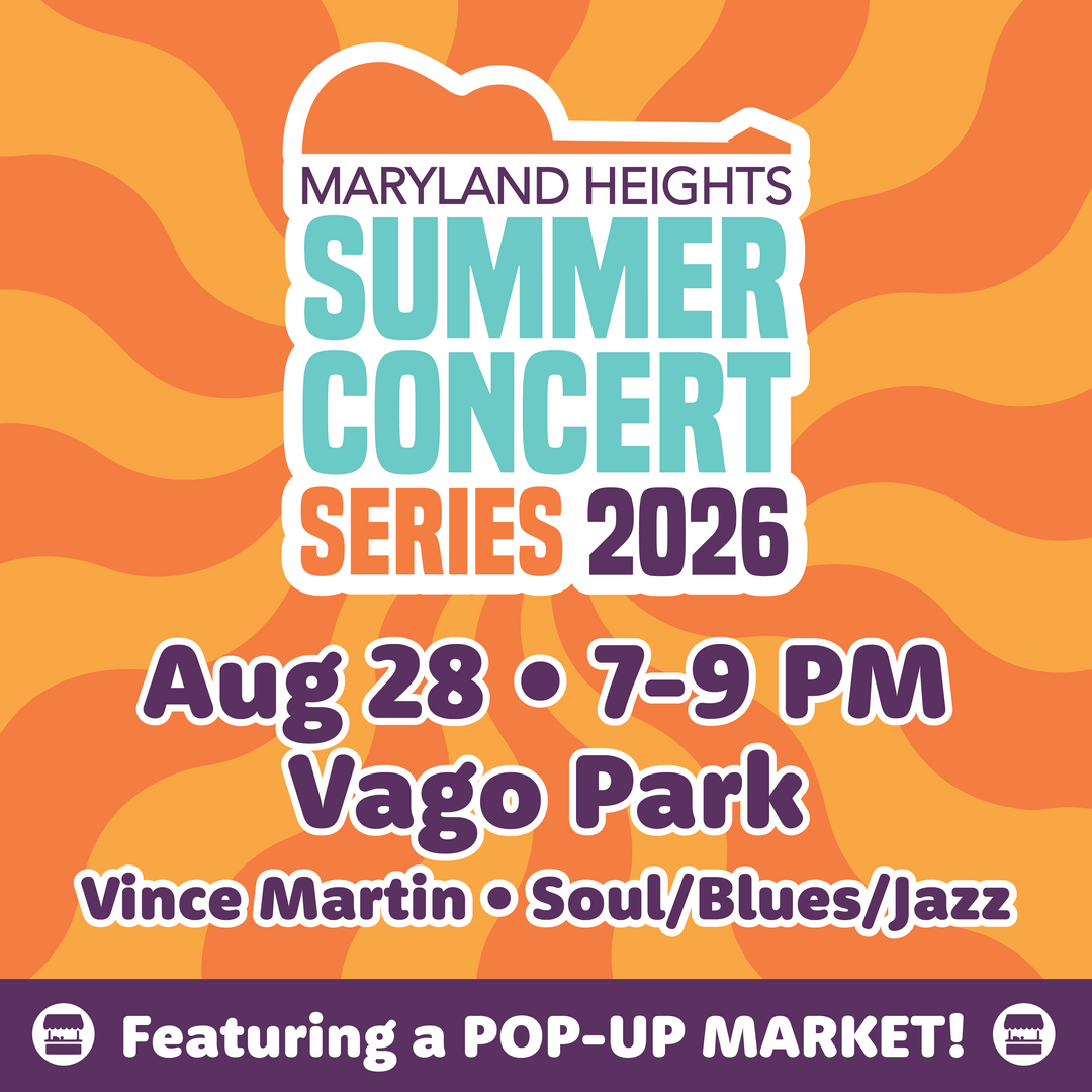 HomeEventsMaryland Heights Summer Concert Series + Pop-Up Market Maryland Heights Summer Concert Series + Pop-Up Market Friday, August 28, 2026 7:00 PM - 9:00 PM 7:00 PM - 9:00 PM See all dates and Times Vago Park Parking Deals Get a Ride LYFT UBER Add to Calendar 08/28/2026 07:00 PM 08/28/2026 09:00 PM America/Atikokan Maryland Heights Summer Concert Series + Pop-Up Market Live music is back in the Maryland Heights parks! All concerts are FREE and all ages are welcome. Performance By: Vince Martin (Soul/Blues/Jazz). Plus, shop the various vendors at our pop-up market from 5:30–8:30 p.m. Details & Tickets: https://www.upcomingevents.com/st-louis/events/vago-park/maryland-heights-summer-concert-series-pop-up-market-638461?ref=uceaddevent Vago Park, 2700 Fee Fee Road, Maryland Heights, MO, 63043 Set Reminder Categories Benefits Charity, Business & Networking, Business-Related, Fundraising & Charity, Indoor / Outdoor Event, Live Entertainment, Live Performance, Neighborhood, Performing Arts, Politics & Activism Live music is back in the Maryland Heights parks! All concerts are FREE and all ages are welcome. Performance By: Vince Martin (Soul/Blues/Jazz). Plus, shop the various vendors at our pop-up market from 5:30–8:30 p.m.