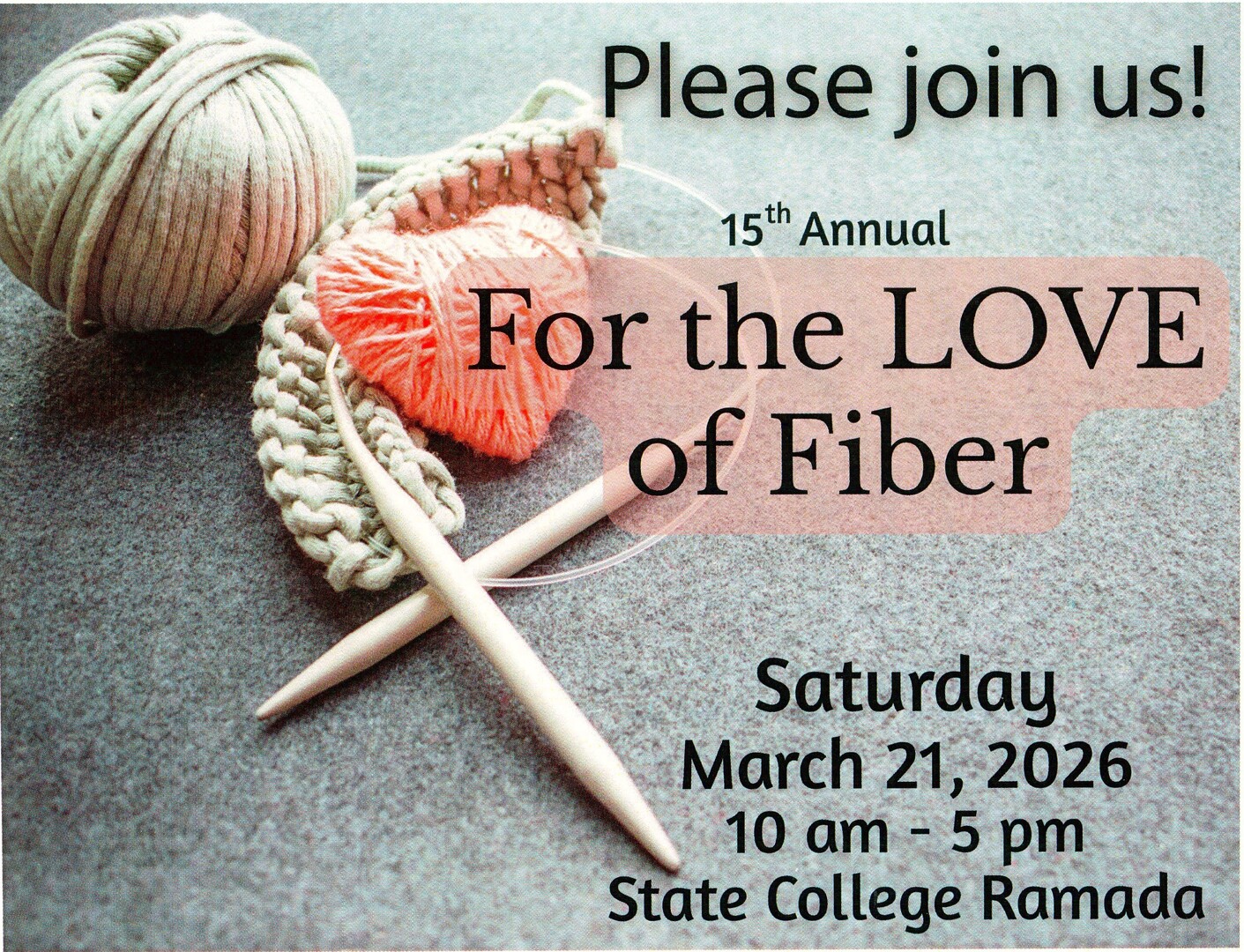 Centre Knitters Guild presents For the LOVE of Fiber, a gathering of local fiber guilds (Knitting, Spinning, Weaving, Embroidery) designed to promote an exchange of ideas, skills and enthusiasm of all fiber related interests. We invite everyone throughout Central PA who spins, knits, crochets, felts, tats, weaves, embroiders, makes lace, or otherwise works with fiber, to join us for a day of fiber fun! Visit the fiber related merchant area and watch informative demonstrations. Participate in mini-classes and bid on Silent Auction fibery baskets. The Knit Doctor will be IN!