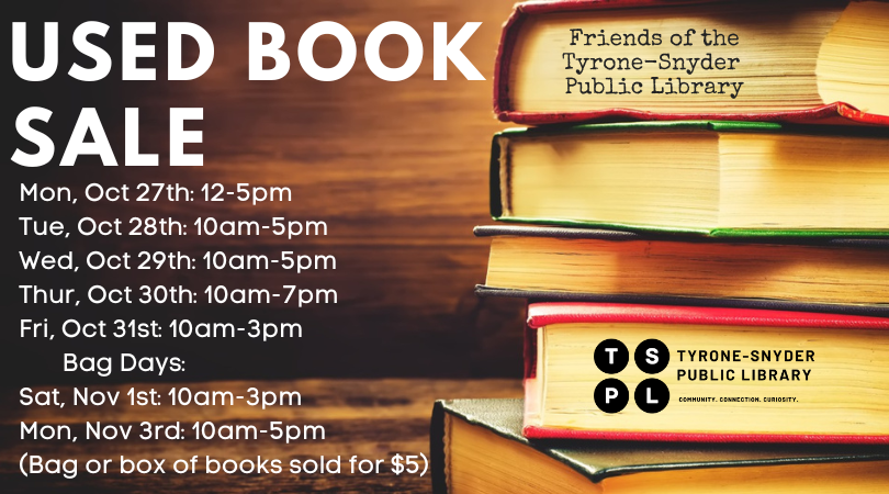 The Friends of the Tyrone-Snyder Public Library's Used Book Sale includes adult and children's fiction and nonfiction books, CDs, DVDs, VHS tapes, cassette tapes, games, puzzles, and past Tyrone High School yearbooks. The last two days of the sale, Saturday, May 17th and Monday, May 19th are bag days, which means a whole bag or box of books is $5.
