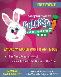 Sonny the Bunny returns for the Colossal Carrot Adventure! Join us for this FREE event featuring a festive bunny trail you can hop along and collect treat-filled eggs, holiday-themed photos with Selfie Snapshots and amazing raffle prizes, including an iPlay America Mega Birthday Party. Plus, dine at The Bistro for photos with Sonny the Bunny!