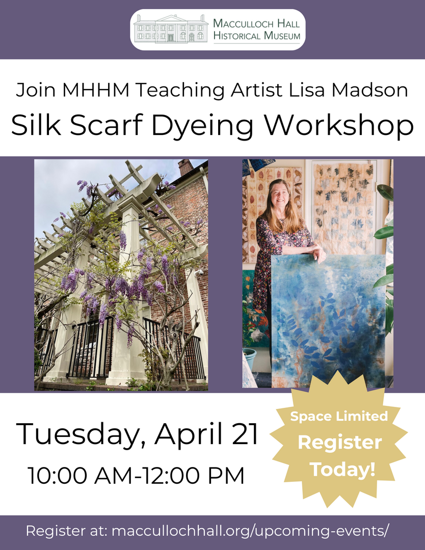 In this workshop, participants will explore the techniques to dye a silk scarf and a tea towel. Be inspired by the brilliant purples and blues of the MHHM garden wisteria to create your own wearable statement piece. Participants are encouraged to bring and wear clothes they don't mind getting messy and/or an apron.