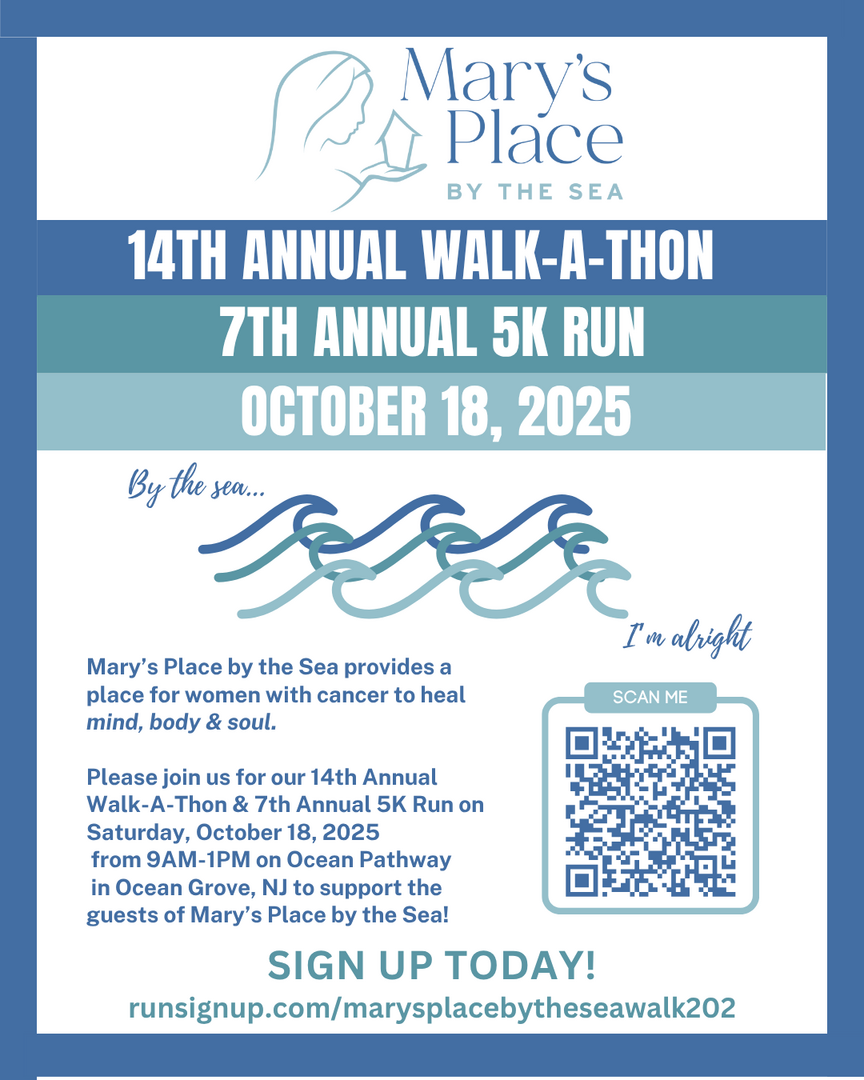 Join us Saturday, October 18th, 2025, on Ocean Pathway in Ocean Grove, New Jersey, as we walk, run, dance, and celebrate in support of the incredible women of Mary’s Place by the Sea.