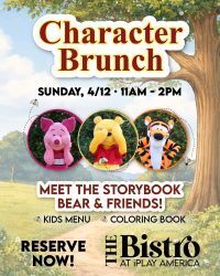 Brunch with the Jumping Tiger, Cute Pig, and Honey Bear at The Bistro! April 12th from 11a-2pm, enjoy photo-ops, a specialty kids menu and a themed coloring book!