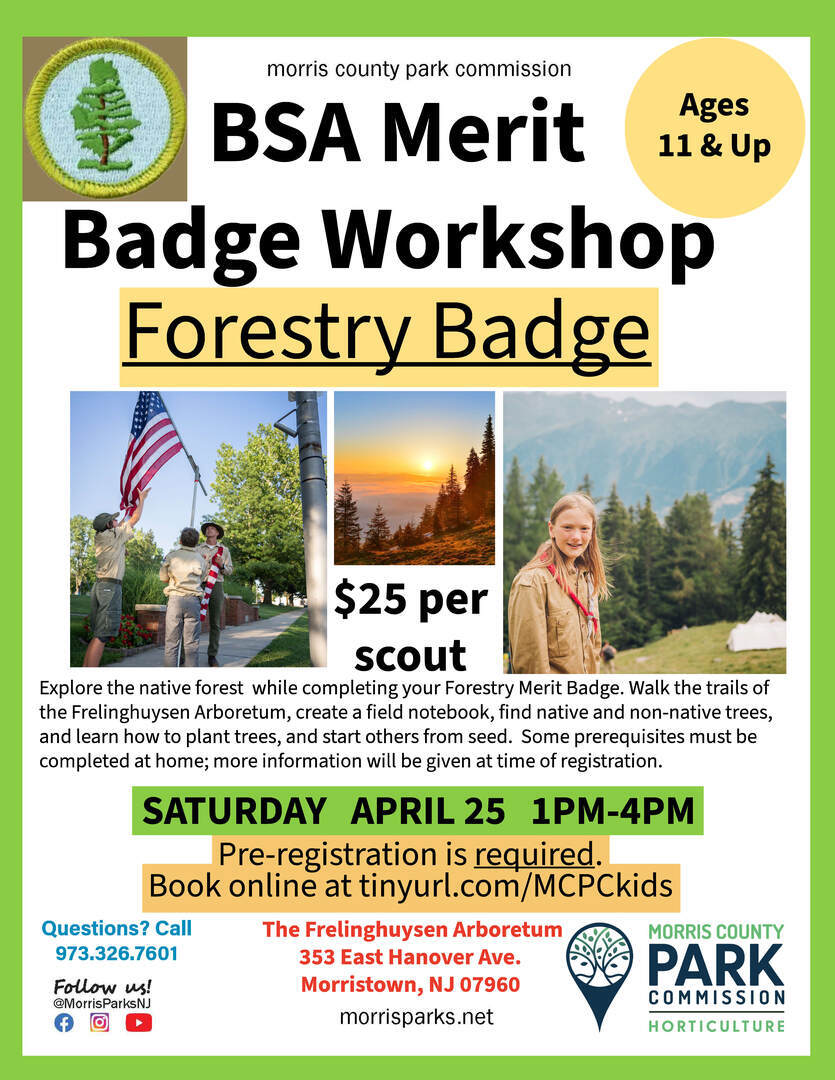 Explore the native forest while completing your Forestry Merit Badge. Walk the trails of the Frelinghuysen Arboretum, create a field notebook, find native and non-native trees, learn how to plant trees, and start others from seed. Some prerequisites must be completed at home; more information will be given at the time of registration.