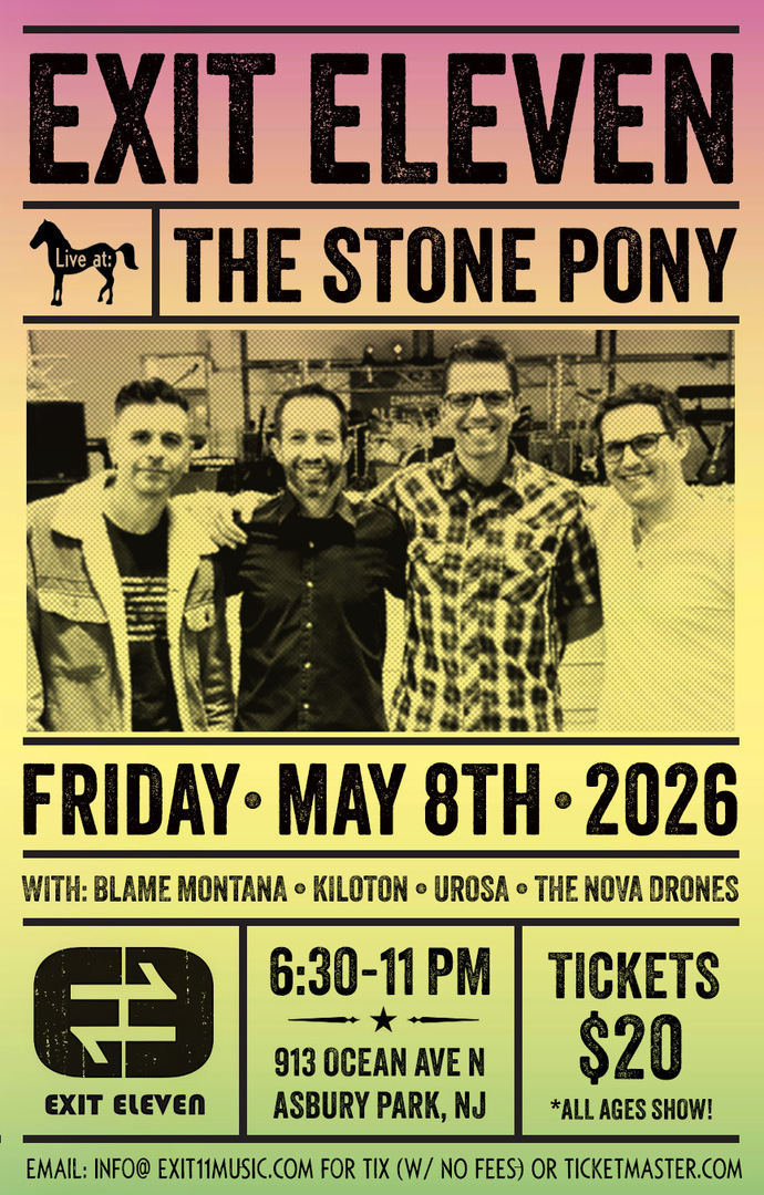 Join us for a Friday night of rock at the legendary Stone Pony! Featuring local outstanding bands Blame Montana, Kiloton, Urosa, The Nova Drones, and of course Exit Eleven, which is celebrating the release of their new song, Fairweather Friends on all streaming platforms. This is an ALL-AGES show!!! Some advance tickets may still be available from the bands, reach out to them directly to check: [email protected]. Otherwise available at the door or Ticketmaster link below.