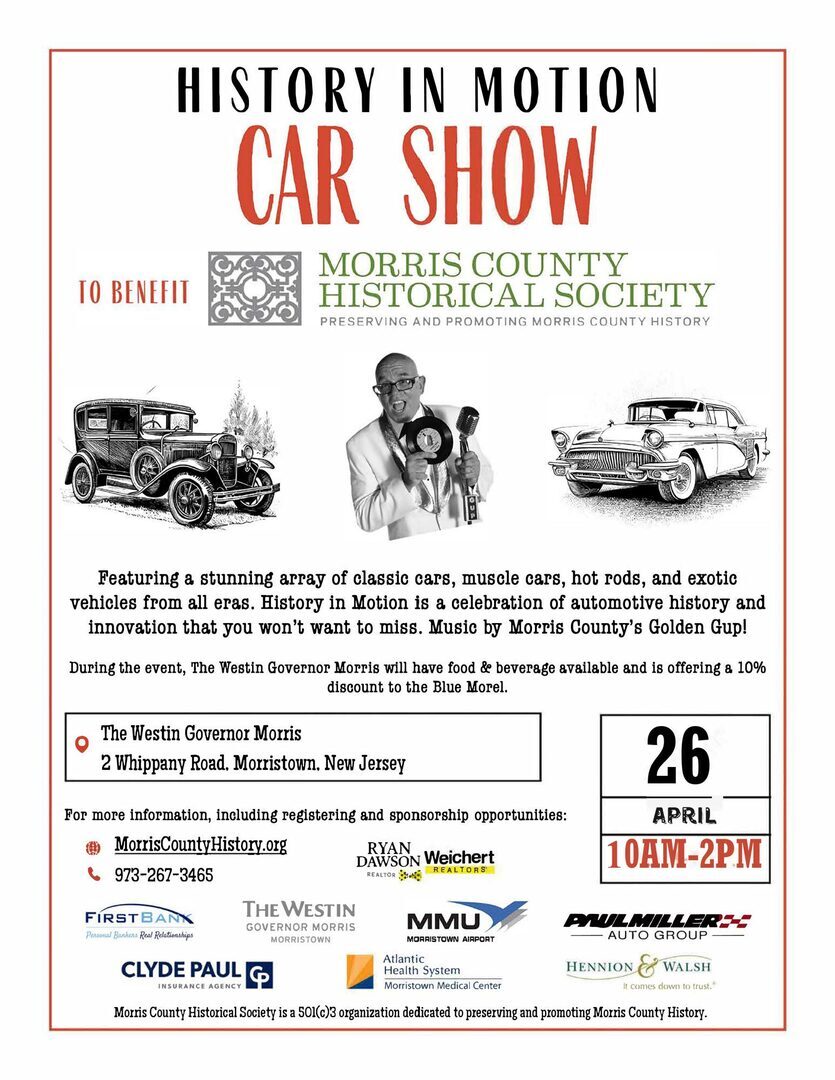 Join Morris County Historical Society at The Westin Governor Morris for our second annual “History in Motion” Car Show. Dozens of classic cars, muscle cars, antique cars, hot rods, and exotic cars, foreign and domestic, will be on display at this fundraiser that celebrates automotive history. Music will be provided by Denville’s Golden Gup from his custom pink 1965 Ford F-100. Next door, at Acorn Hall, attendees will see pieces from MCHS’s collection, including a spindle seat carriage, one-horse open sleigh, high-wheel bicycle, ice sled, and other historic pieces of personal transportation. Local historians and historical societies will also be on hand with exhibits and displays related to local history. Admission is free. MCHS thanks current sponsors The Westin Governor Morris, Clyde Paul, First Bank, Morristown Airport, Paul Miller Auto Group, Hennion & Walsh, Atlantic Health, and Ryan Dawson, Weichert Real Estate. We also thank Ship Morristown; Hans Clothier; Shade Tree Garage; Rokbuttomed; Rumble Boxing; Elizabeth Gray Kogen; Victor Maisano, CPA; the Turner Family; and the Platt Family for their support. To register your car for the show go to: https://morriscountyhistory.org/history-in-motion-car-show/Doz