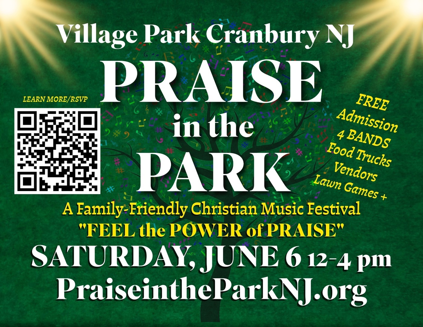 Get ready to lift your spirits and celebrate faith, family, and fun at Praise in the Park on Saturday, June 6, 2026, from 12:00 PM to 4:00 PM in Village Park, Cranbury, NJ. This vibrant, family-friendly event is free to attend! Learn more and secure your tickets now at Eventbrite!