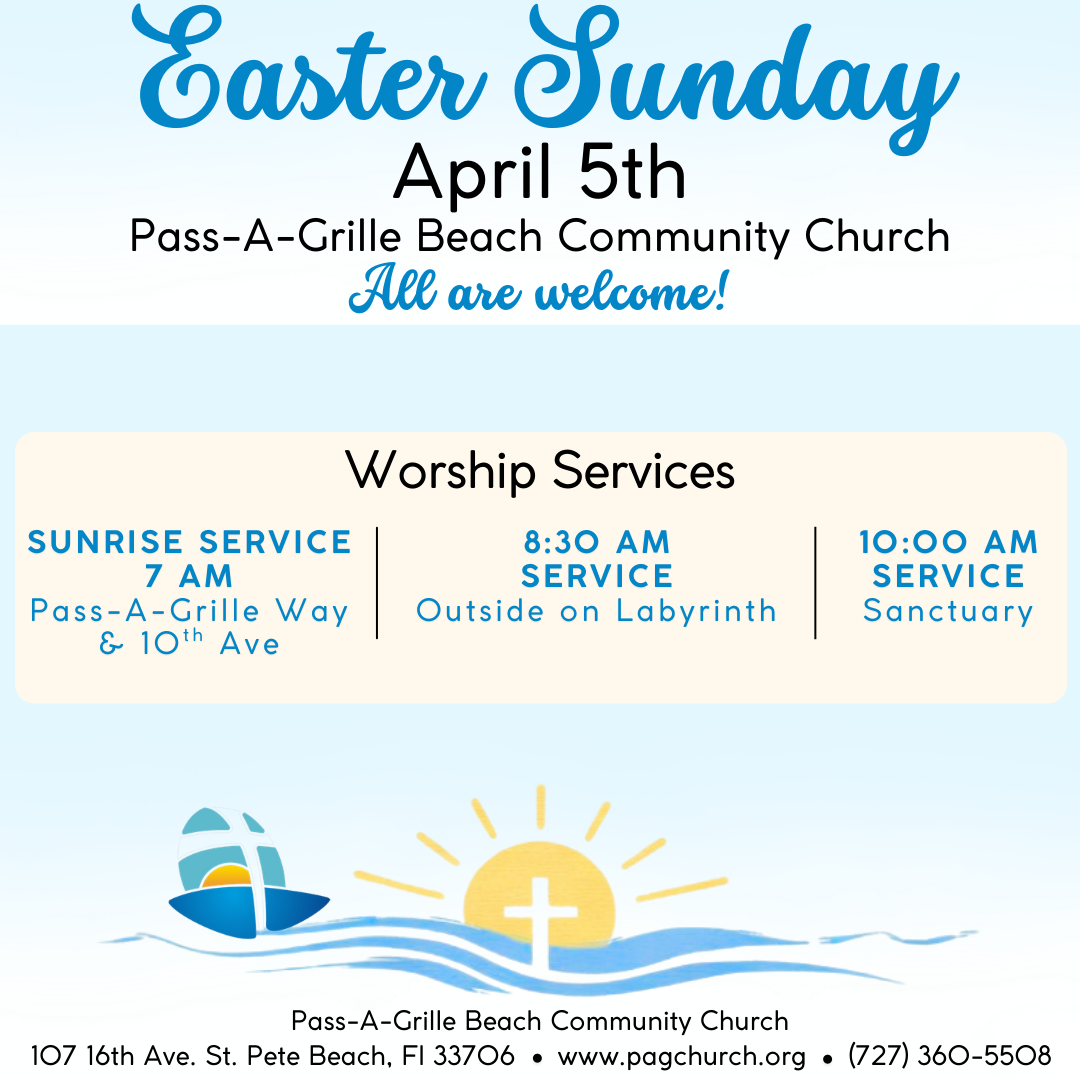 Celebrate the joy and hope of Easter with Pass-A-Grille Beach Community Church on April 5, with a morning filled with meaningful worship in beautiful coastal settings. All are warmly welcome to attend any or all of the services.