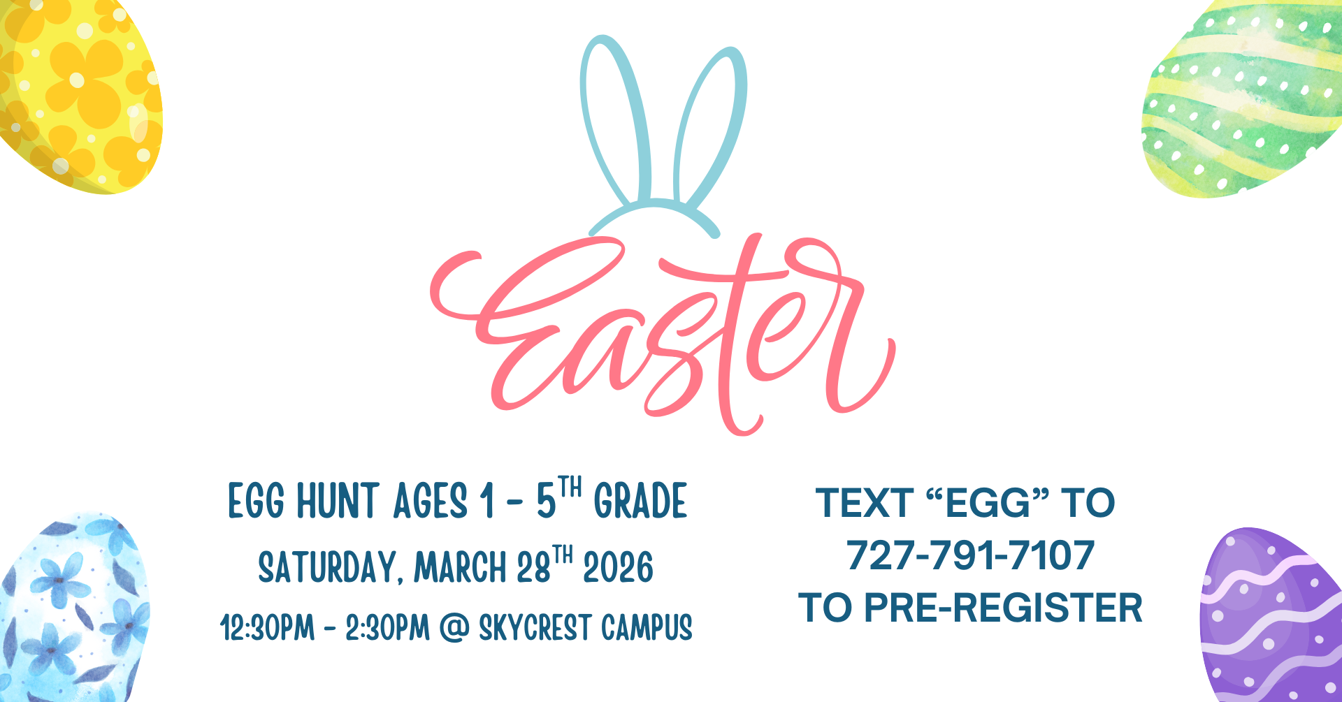 Skycrest Community Church is hosting a FREE Easter Egg Hunt for kids (1 year old – 5th grade), and it’s open to everyone.