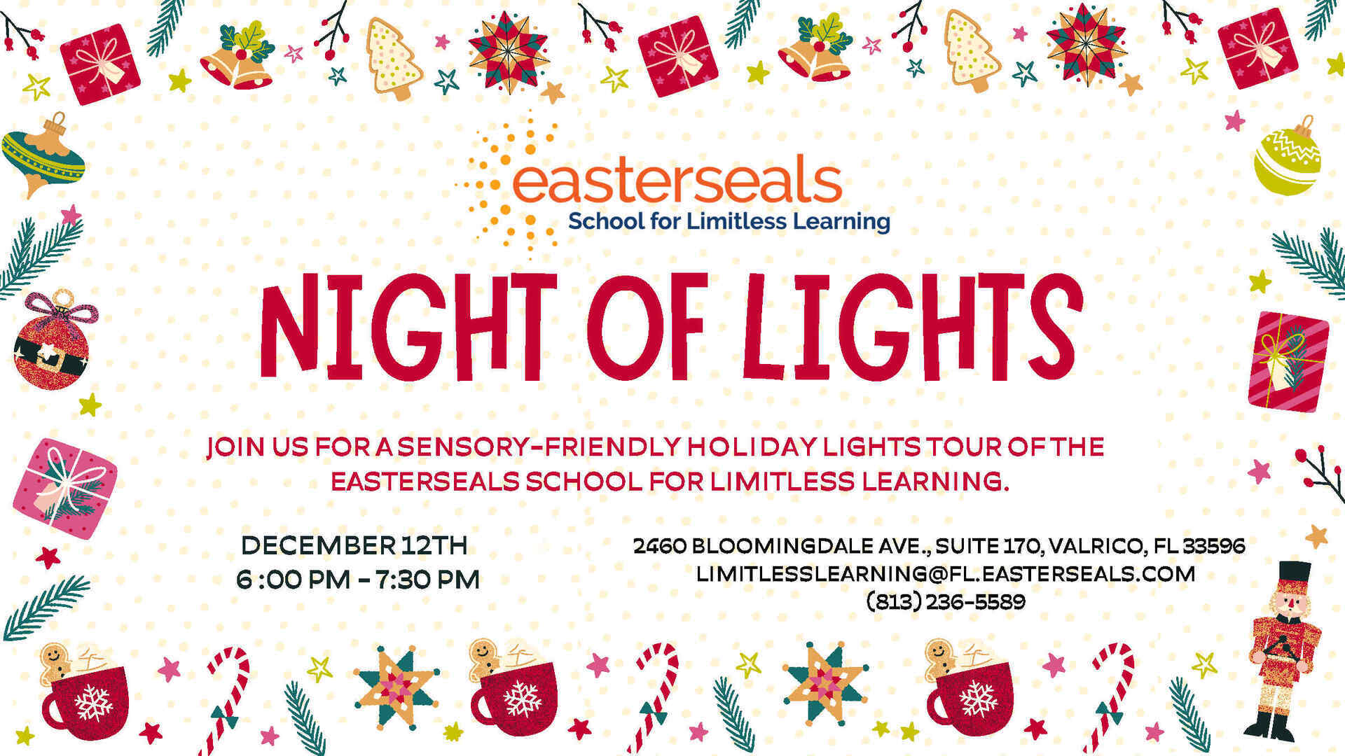 This holiday season, come and experience the magic of lights in a unique and inclusive way. We’re excited to offer a sensory-friendly holiday lights tour at the Easterseals School for Limitless Learning, designed to provide a festive and comfortable atmosphere for individuals of all abilities.