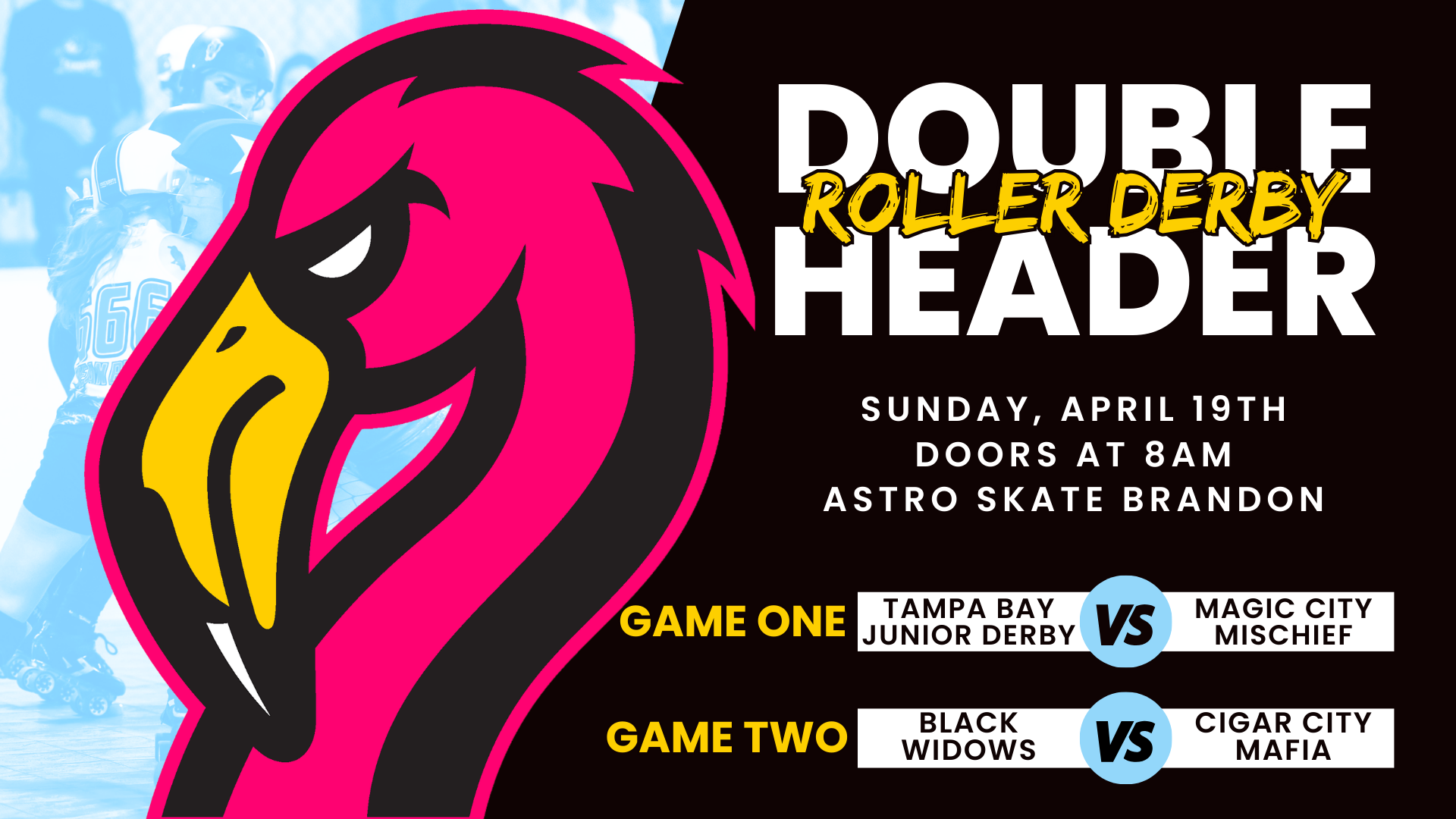 Doors open at 8a, first whistle is at 8:30a. Please bring chairs to sit trackside, none will be provided. Tickets are $20 online or at the door. Reduced ticket prices for seniors at the door, and kids under 8 get in free! Online tickets sold here: https://www.tamparollerderby.net/events-1/tampa-roller-derby-double-header