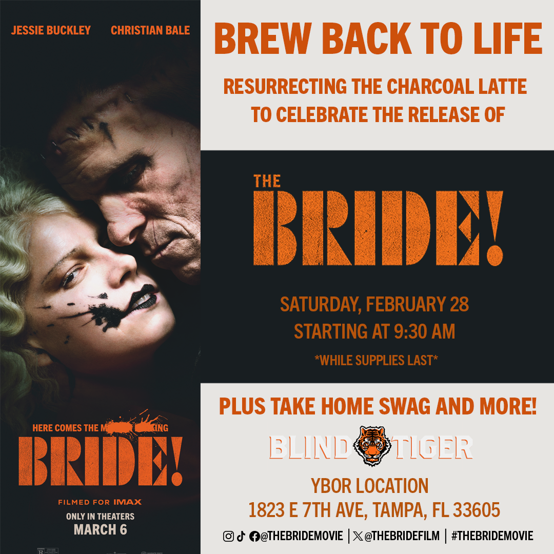 Join Blind Tiger Coffee Roasters (Ybor City Location) on 2/28 for Brew Back to Life & Celebrate THE BRIDE! First 25 guests starting at 9:30AM will receive a specialty coffee for free. Enjoy a photo station and exclusive movie swag, while supplies last!