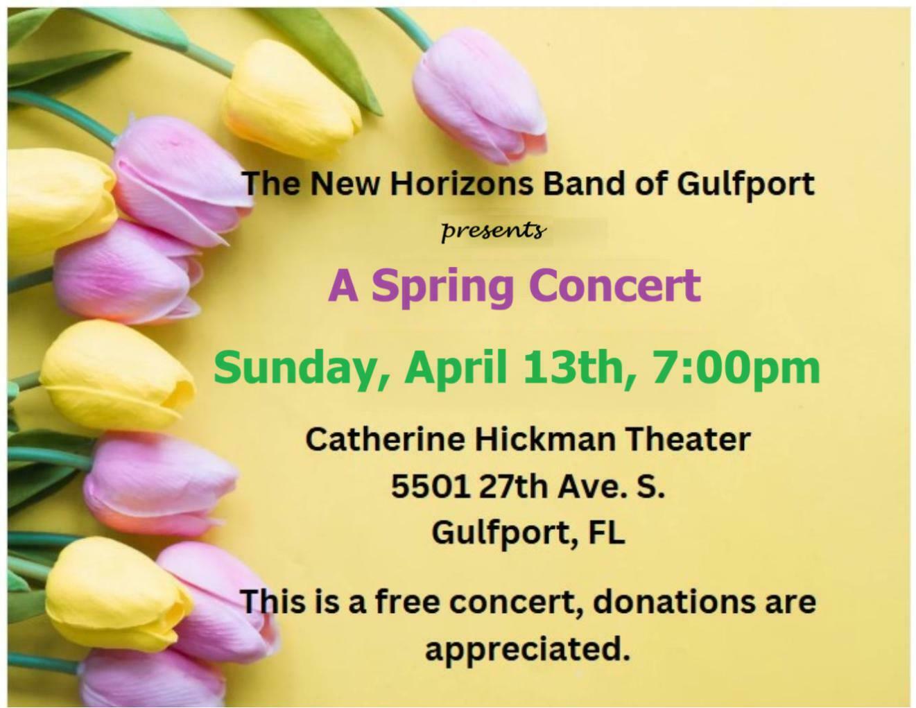 HomeEventsFree Concert: New Horizons Band of Gulfport ConcertBands This Event has Passed Free Concert: New Horizons Band of Gulfport ConcertBands Sunday, April 13, 2025 7:00 PM - 8:00 PM 7:00 PM - 8:00 PM See all dates and Times Catherine A Hickman Theater Parking Deals Get a Ride LYFT UBER Add to Calendar 04/13/2025 07:00 PM 04/13/2025 08:00 PM America/Atikokan Free Concert: New Horizons Band of Gulfport ConcertBands Free concert Details & Tickets: https://www.upcomingevents.com/tampa/events/catherine-a-hickman-theater/free-concert-new-horizons-band-of-gulfport-concertbands-417495?ref=uceaddevent Catherine A Hickman Theater, 5501 27th Avenue South, Gulfport, FL, 33707 Set Reminder Categories Live Performance, Performing Arts Free concert