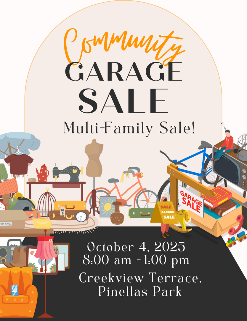 HomeEventsCommunity Garage Sale in Pinellas Park This Event has Passed Community Garage Sale in Pinellas Park Saturday, October 04, 2025 8:00 AM - 1:00 PM 8:00 AM - 1:00 PM See all dates and Times Creekview Terrace Parking Deals Get a Ride LYFT UBER Add to Calendar 10/04/2025 08:00 AM 10/04/2025 01:00 PM America/Anguilla Community Garage Sale in Pinellas Park The neighbors of the Creekview Terrace cul-de-sac in Pinellas Park will come together for a large multi-family yard sale on October 4th, 8am - 1pm. Details & Tickets: https://www.upcomingevents.com/tampa/events/creekview-terrace/community-garage-sale-in-pinellas-park-524399?ref=uceaddevent Creekview Terrace, Creekview Terrace, Pinellas Park, FL, 33781 Set Reminder Categories Neighborhood, Outdoor Event The neighbors of the Creekview Terrace cul-de-sac in Pinellas Park will come together for a large multi-family yard sale on October 4th, 8am - 1pm.