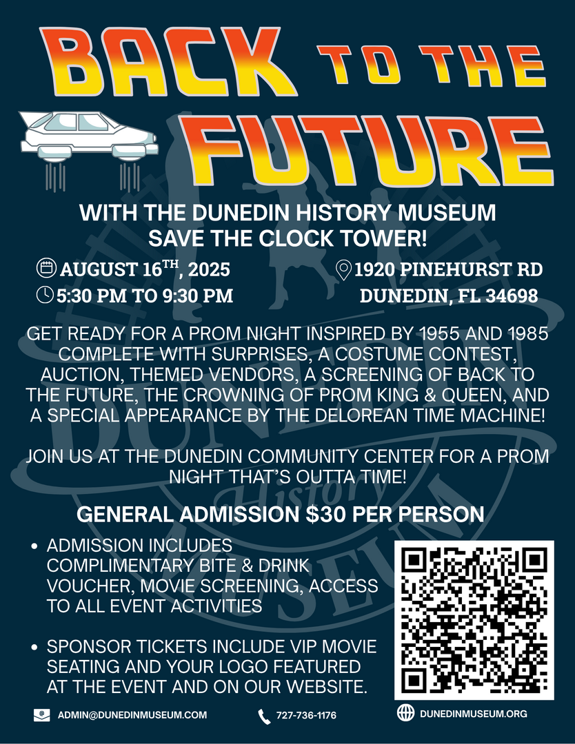 Hop in the DeLorean and get ready for a night where past and future collide! The Dunedin History Museum is throwing a prom-inspired celebration in honor of the 40th anniversary of Back to the Future — and you're invited. We’re turning back the clock to help restore our iconic clock tower, which has been stuck in time ever since a lightning strike five years ago.